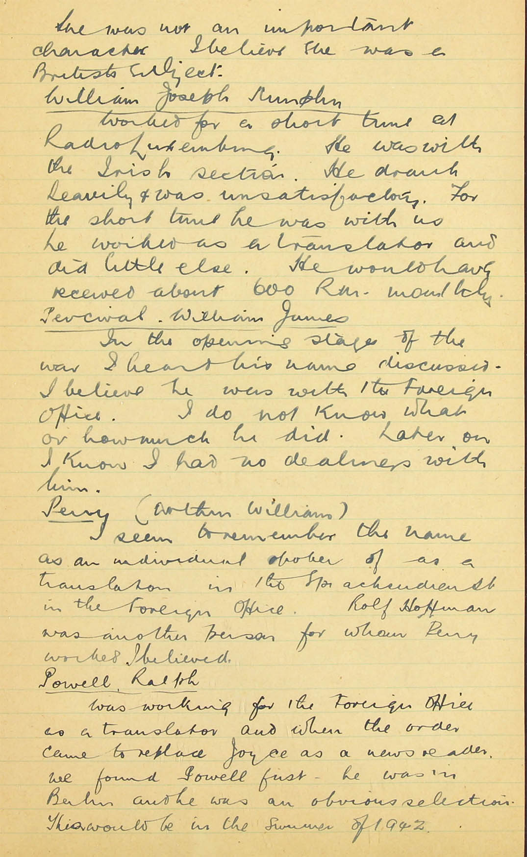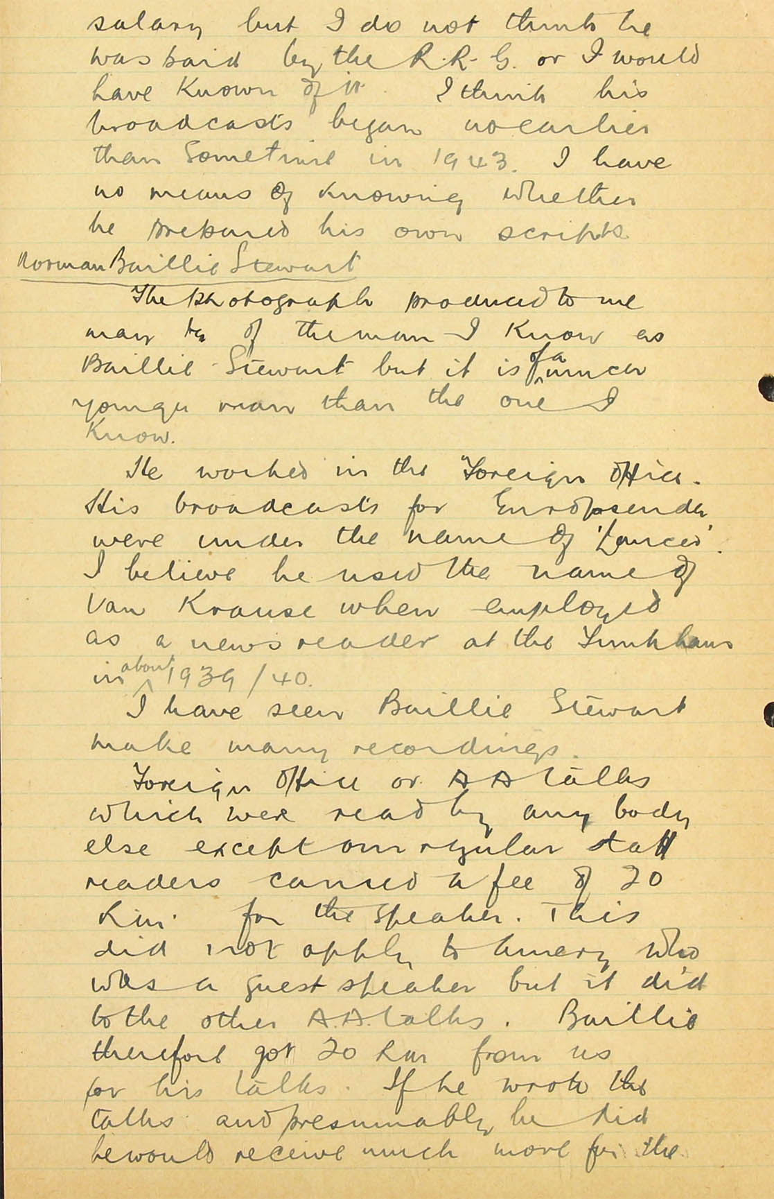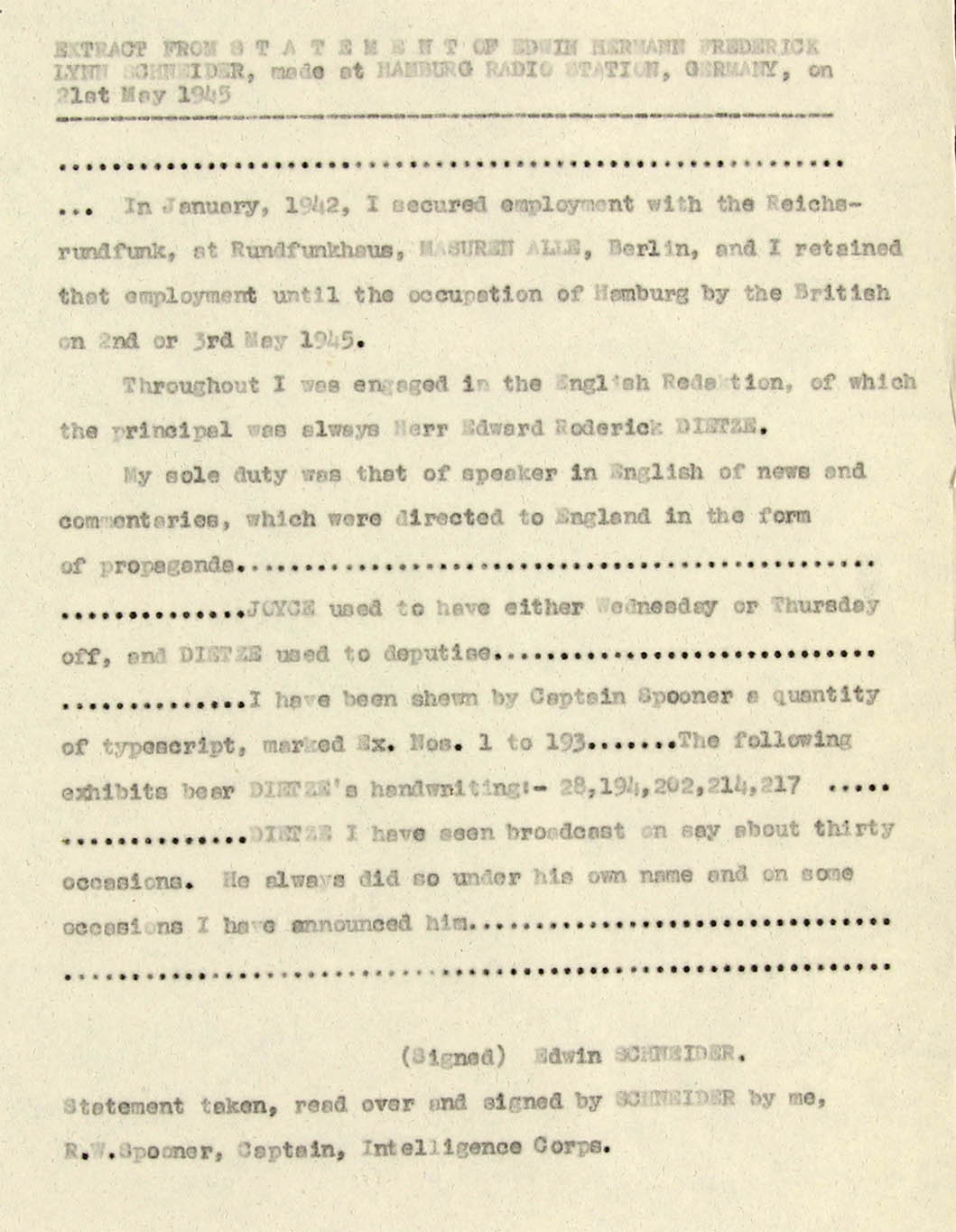 I am afraid that none of our monitors know him and therefore could not identify his voice. I personally heard him very early on in the war in a Zeesen (AOB: Auswärtiges Amt; A.A.) transmission for Africa, reading a summary in English of one of Hitler's speeches, but never heard him take part in any of the Haw-Haw broadcasts to England and I have not heard him take part in any broadcast in German, either at the beginning of the war or more recently, but I listen so infrequently that my evidence on this point is not really very valuable.