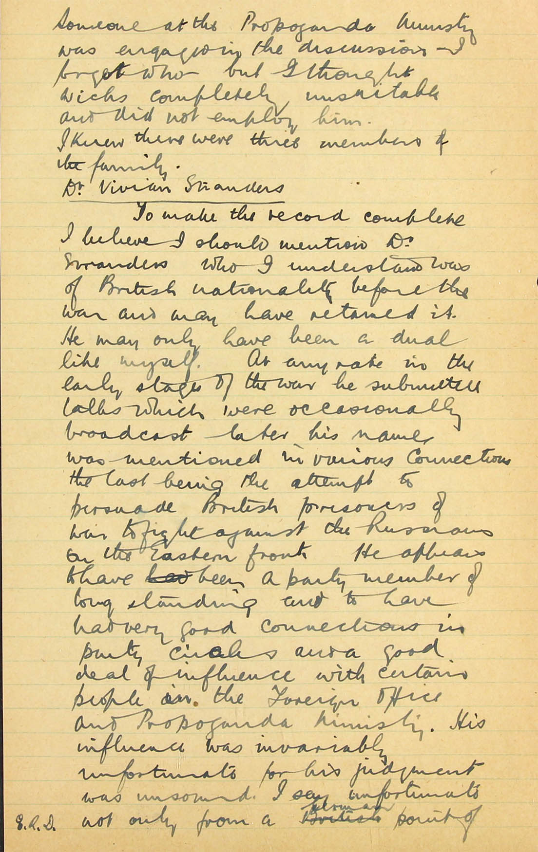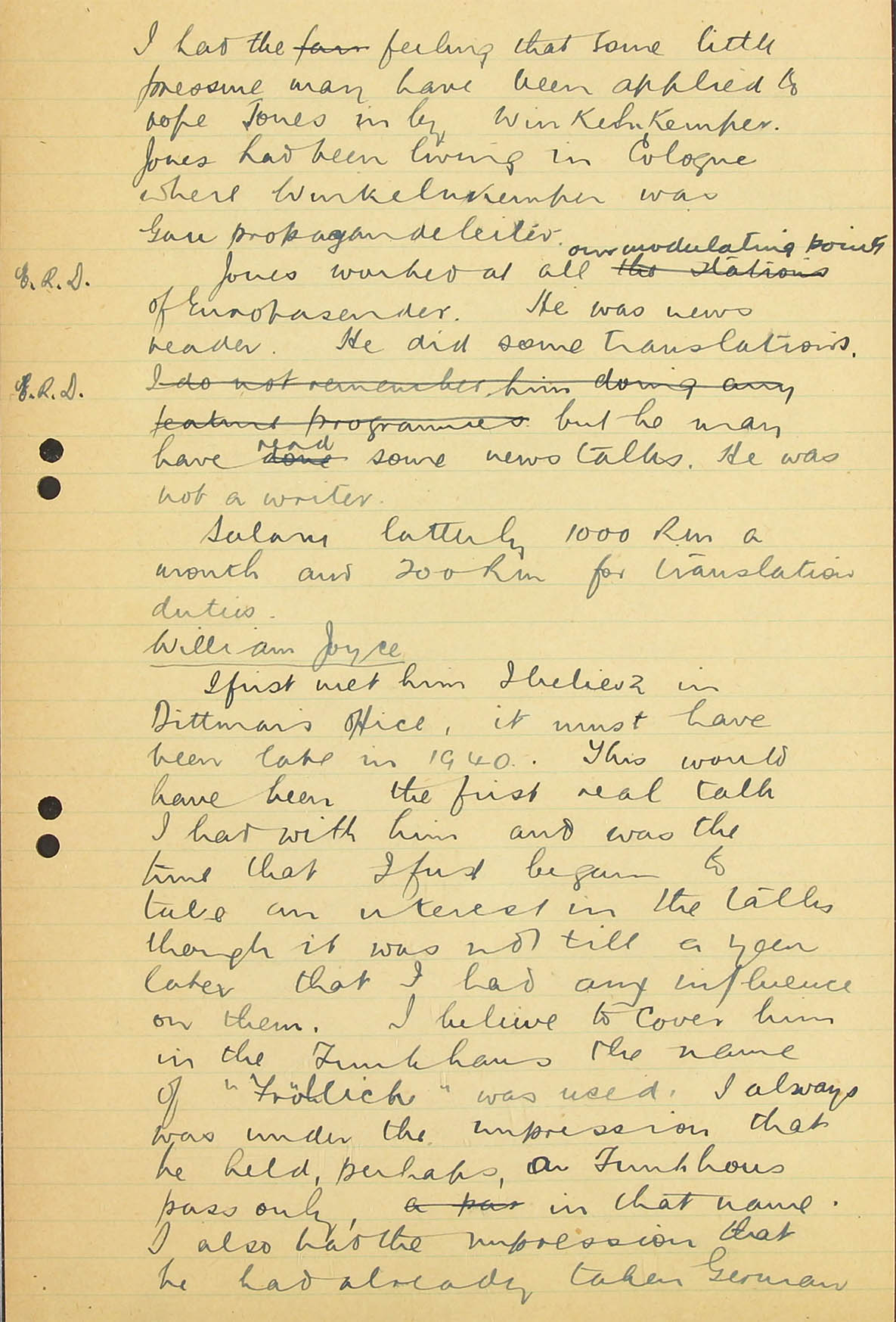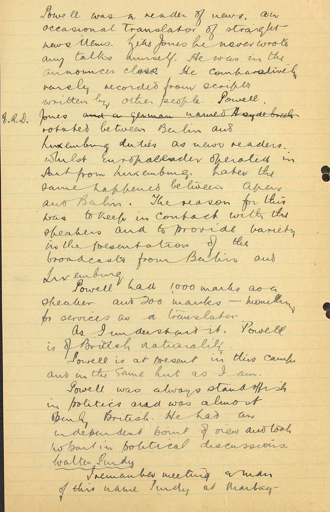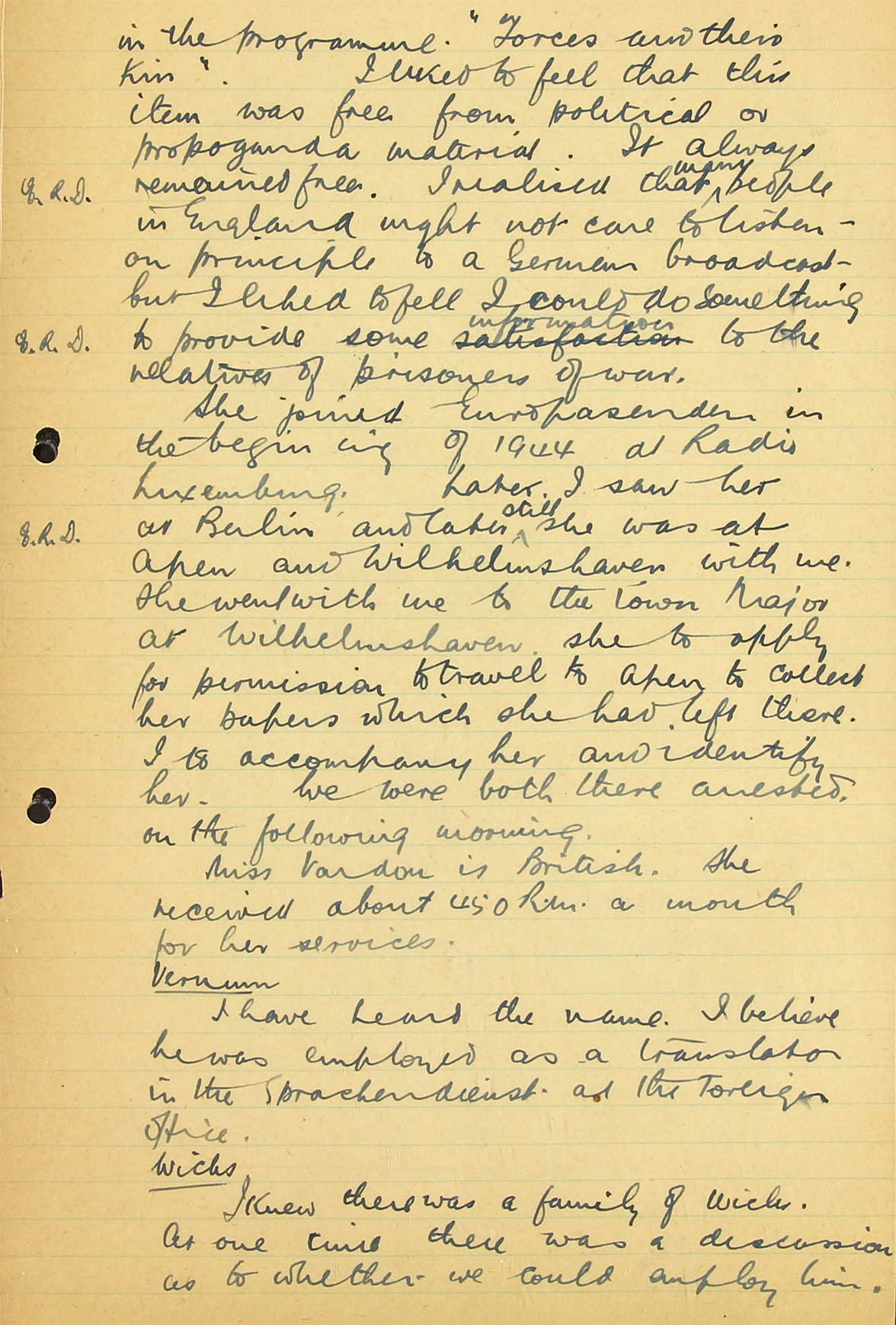 I am afraid that none of our monitors know him and therefore could not identify his voice. I personally heard him very early on in the war in a Zeesen (AOB: Auswärtiges Amt; A.A.) transmission for Africa, reading a summary in English of one of Hitler's speeches, but never heard him take part in any of the Haw-Haw broadcasts to England and I have not heard him take part in any broadcast in German, either at the beginning of the war or more recently, but I listen so infrequently that my evidence on this point is not really very valuable.