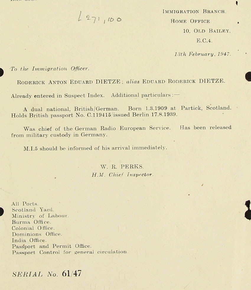 (maybe name deleted) with regard to the W.S. Form 17 attached, I have acted on the assumption that Dietze, if he come to this country, will travel on a British passport. (AOB: Dietze possessed dual nationalities: German and British; he was bi-lingual) In any event he would probably claim British nationality if he were refused leave to land. I suppose, therefore, there is no object in instruction the Ports to refuse him leave to land.