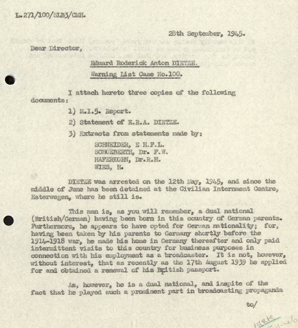 I think there is no doubt that the 'Eduard Roderick Dietze now broadcasting in the German European Service is the 'Dr. Eduard R. Dietze' of whom the BBC has pre-war records at the following address: Babelsberg Bezirk Potsdam, An den Sternwarte 1, Berlin. I have seen correspondence addressed to the BBC from this individual over the signature "Eduard R. Dietze' - he was frequently given facilities by the Corporation (BBC) during 1933-39 to broadcast commentaries to Germany on behalf of the Reichsrundfunkgesellschaft (RRG) on British national and sporting events such as the Coronation, Wimbledon tournaments etc. I believe he attended the alter in his capacity in June 1939 - possibly this visit could be verified through Passport Control department. He never appears to have used any other Christian names on BBC records: it may interest you to know that in 1938/39 he had a personal banking account at Barclay's Bank, Lagham Place, W.1.
