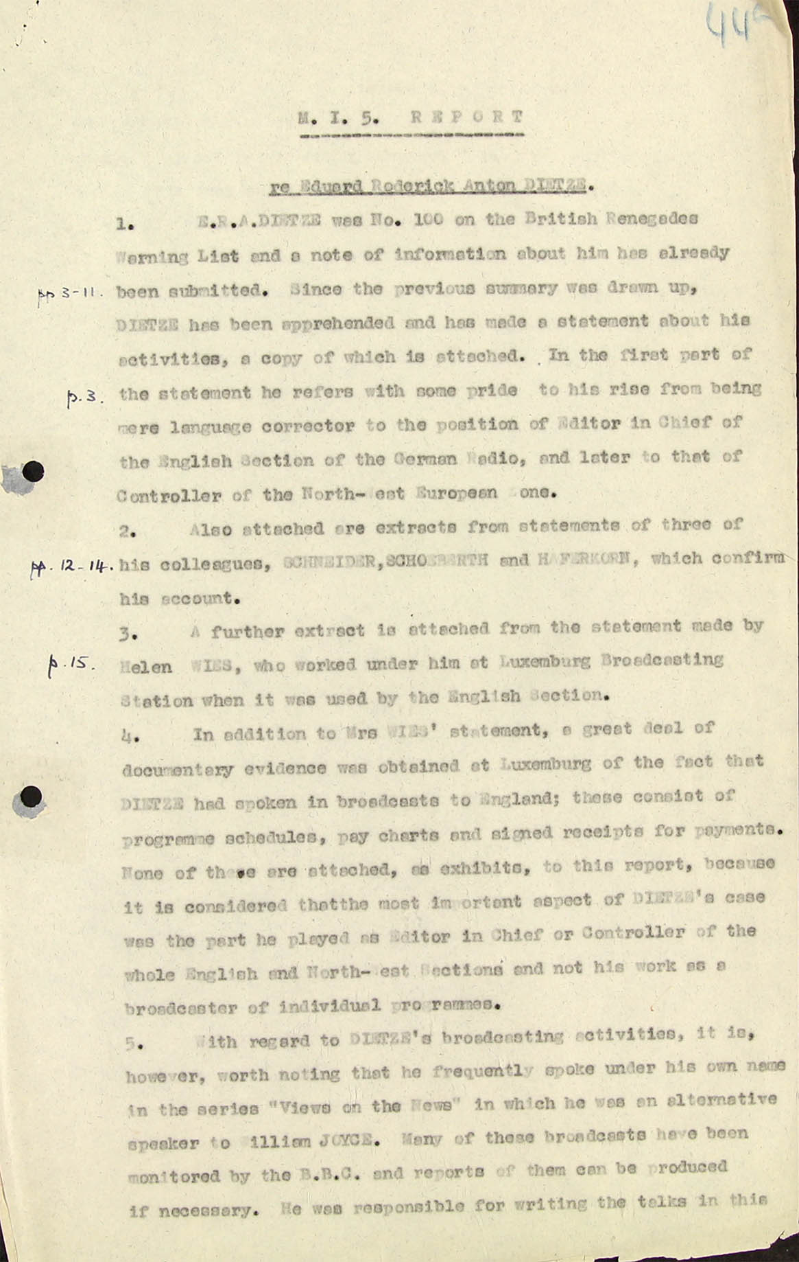 A Miss I.D. Benzie who worked at the B.B.C. said in 1941 that she knew Dietze well. Before the war he had been a news and sports Outside Broadcast commentator for the Reichsrundfunk Gesellschaft and used to come over to Britain several times a year for ceremonial occasions and national sporting events. Miss Benzie said that she knew his voice well and had since the war heard him speak on the radio several times in English in place of William Joyce (= Lord Haw-Haw). She said that in addition to a British passport he also had a German passport. This fact is confirmed →