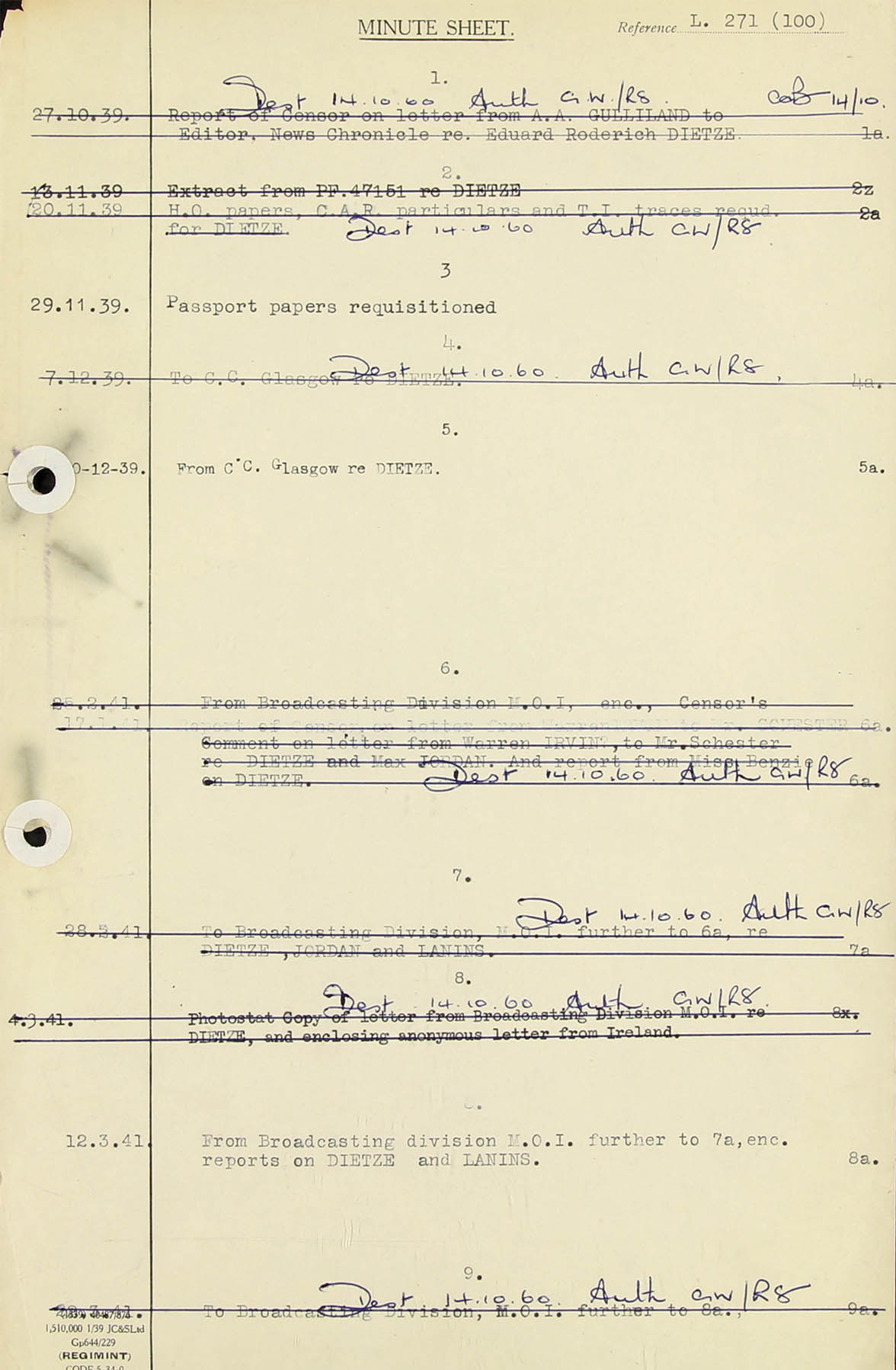 20.11.39. H.O. (Home Office) papers C.A.R. particulars and T.I. traces required for Dietze. 2a.