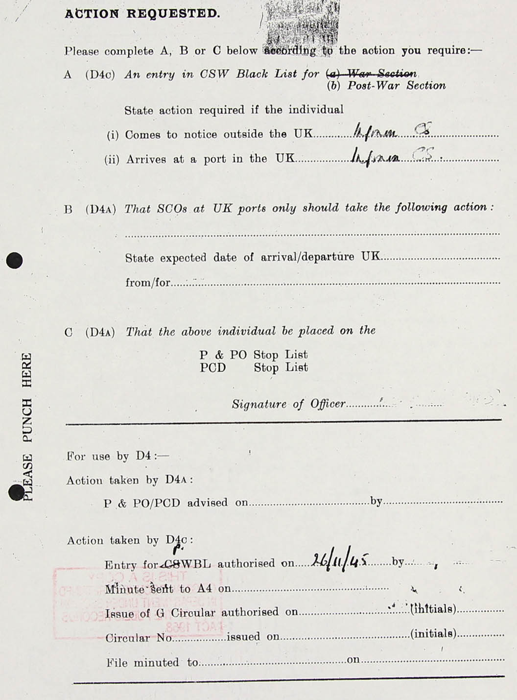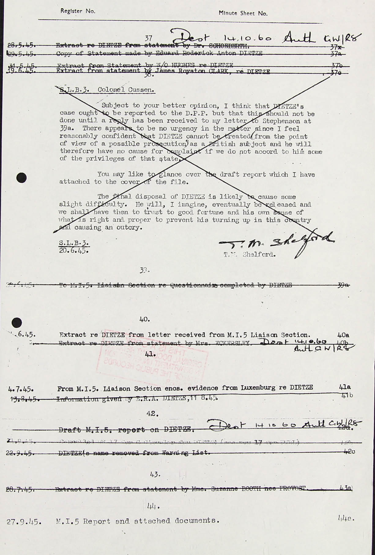 S.B.L.3 (AOB: this branch has something to do with criminal prosecution; whether valid in Dietze's case remains open) 15.5.45 Sgd. T.M. Shelford