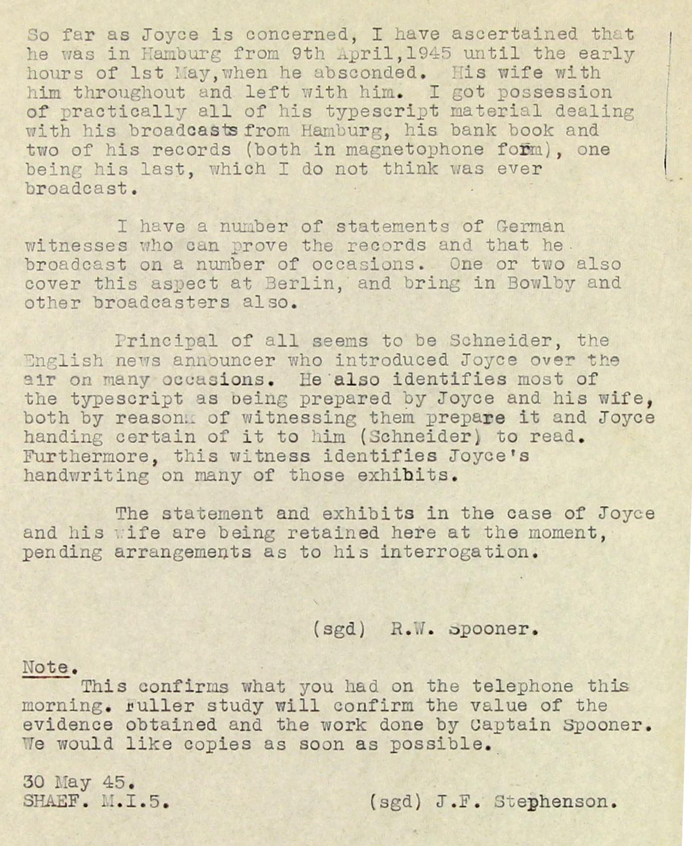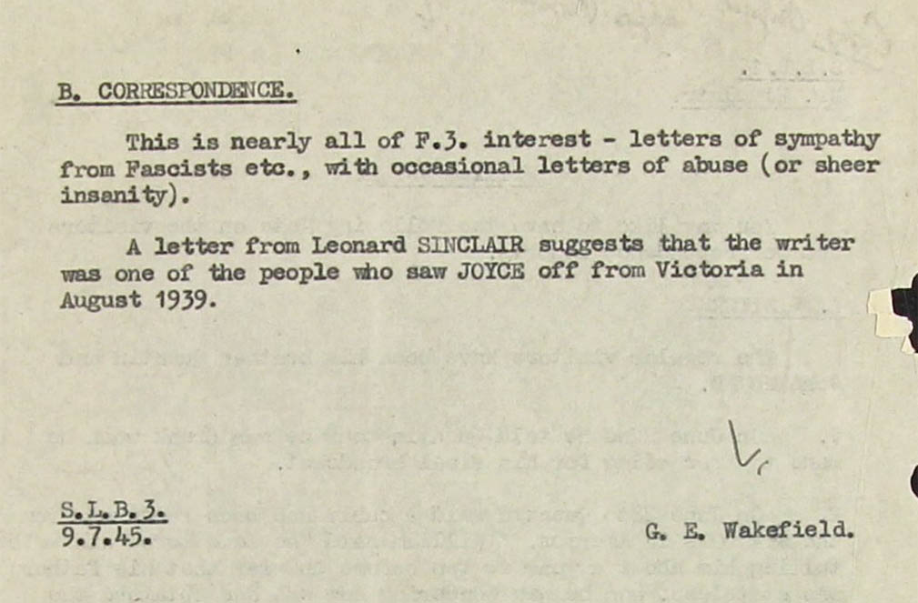 31. During the time I knew Joyce I had very few discussions with him and practically none about politics. On the last evening, however, he talked quite a bit, and his expressed views were substantially in accordance with his last record. (the one of 30 April, which was never transmitted)