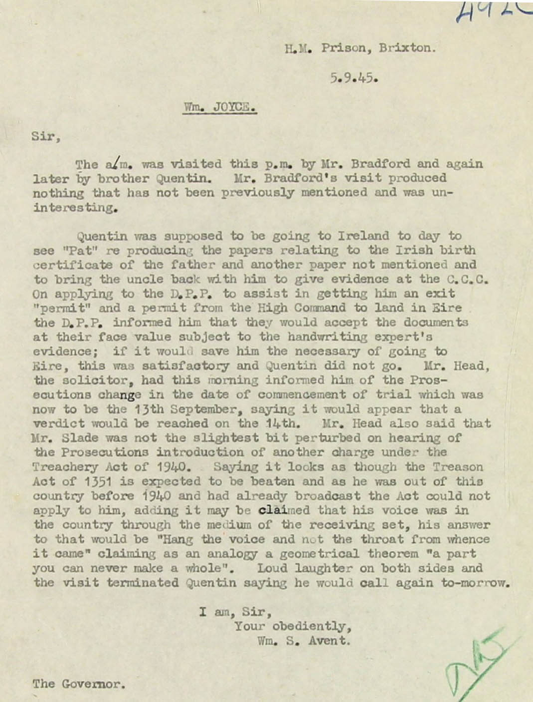 Quentin (Joyce's brother) was supposed to be going to Ireland to day to see "Pat" re producing the papers relating to the Irish birth certificate of the father and another paper not mentioned and to bring the uncle back with him to give evidence at the C.C.C. On applying to the D.P.P. (Director of Public Prosecutions) to assist in getting him an exit "permit" and a permit from the High command to land in Eire the D.P.P. informed him that they would accept the documents at their face value subject to the handwriting expert's evidence; if it would save him the necessary of going to Eire, this was satisfactory and Quentin did not go. Mr. Head, the solicitor, had this morning informed him of the Prosecutions change in the date of commencement of trial which was now to be the 13th September, saying it would appear that a verdict would be reached on the 14th. Mr. Head also said that Mr. Slade was not the slightest bit perturbed (disturbed) on hearing of the Prosecutions introduction of another charge under the Treachery Act of 1940. Saying it looks as though the Treason Act of (the year) 1351 is expected to be beaten and as he was out of this country before 1940 and had already broadcast the Act could not apply to him, adding it may be claimed that his voice was in the country through the medium of the receiving set, his answer to that would be "Hang the voice and not the throat from whence it came" claiming be "Hang the voice and not the throat from wnece it came" claiming as an analogy a geometrical theorem "a part you can never make a whole". Loud laughter on both sides and the visit terminated Quentin saying he would call again tomorrow.
