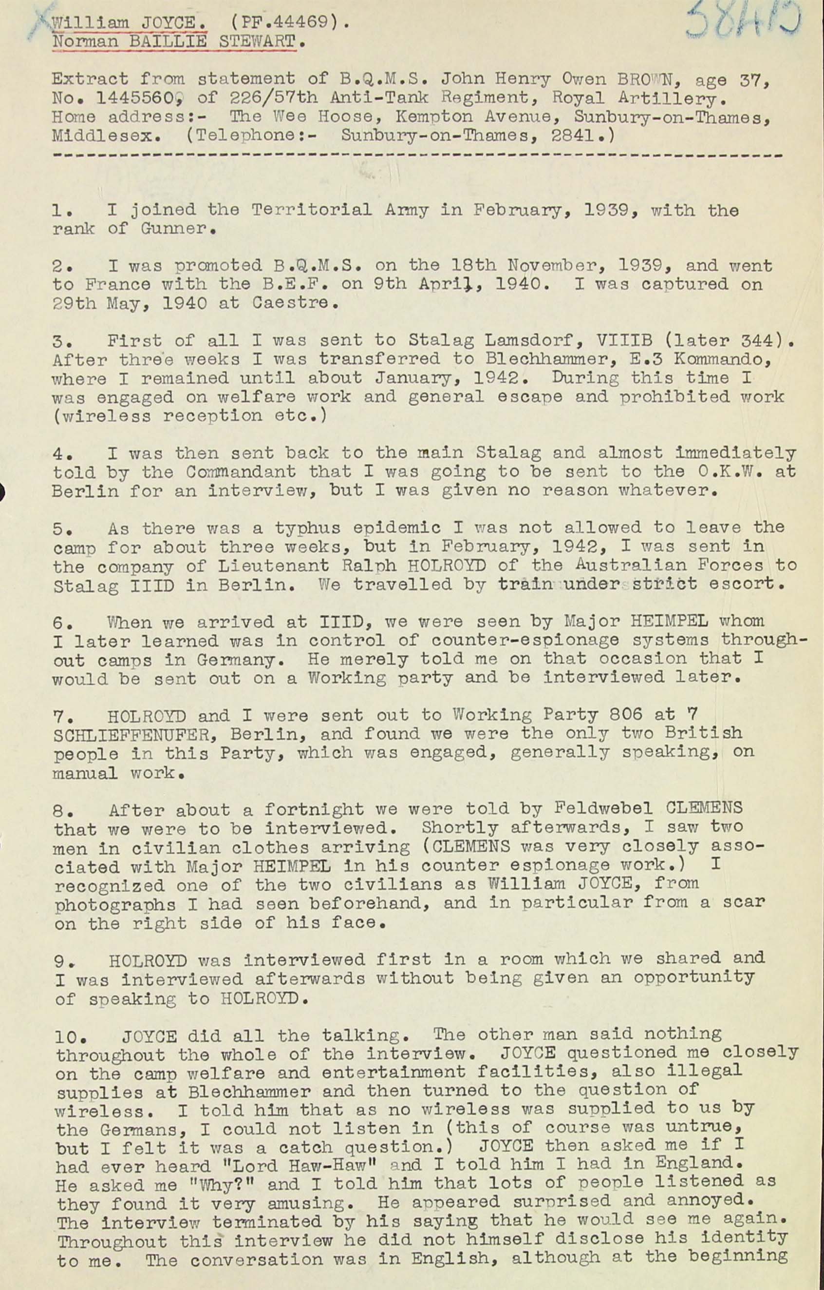 16.6.45 S.B. (Special Branch) Report on arrival of Wm Joyce at RAF Aerodrome (418b)