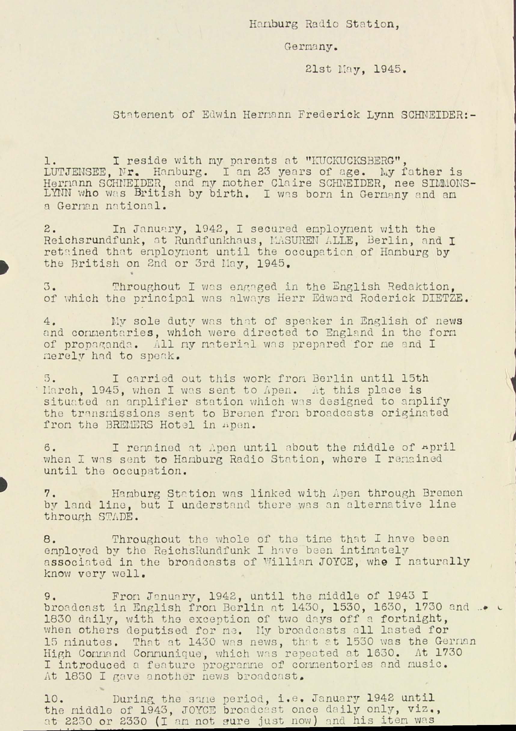 1. I reside with my parents at "Kuckucksberg", Lütjensee, Nr. Hamburg. I am 23 years of age. My father is Hermann Schneider, and my mother Claire Schneider, nee Simmons-Lynn who was British by birth. I was born in Germany and am a German national.