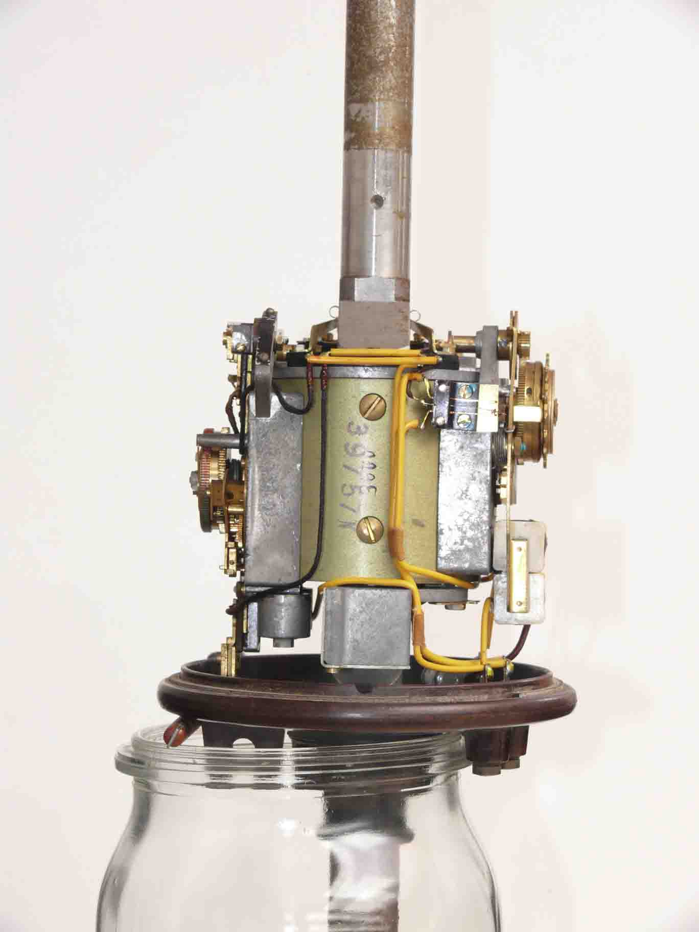 The number of actual events (presetting) before this naval mine initially is being ignited, is (probably) set by the pointer adjusted between 2 and 14. The electromagnetic coil just below the number-scale is to trigger (stepping-up) the electro-mechanical (counter) mechanism. The grips of the number disk-ring, might also been used to winding-up a loaded spring somewhere inside it, as to drive the motion (motion) of the system