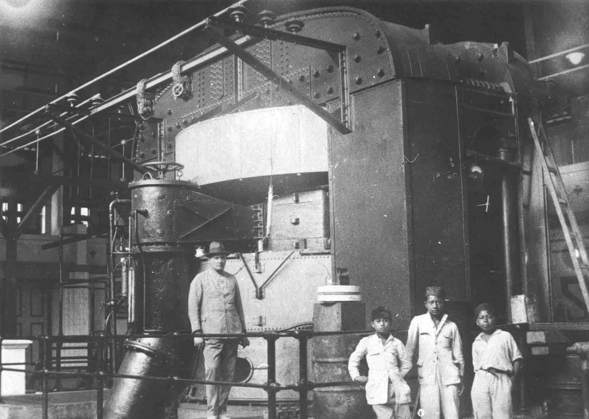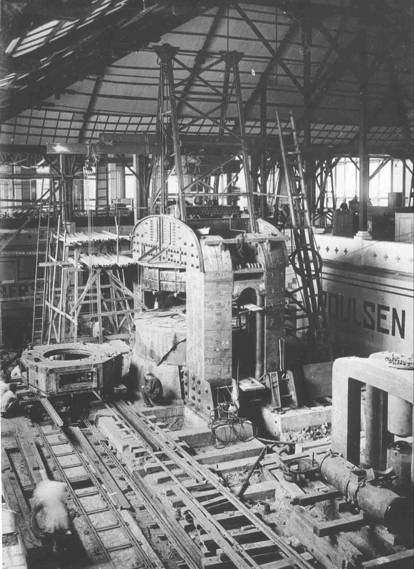 The arc-chamber is reaching its definitive destination. Clearly visible are the lower and upper magnetic coils. The person sitting on his heels, just in front of the main structure, is Mr Brandenburg (a Russian), he was in charge of the transmitter assembly. (May 1922)