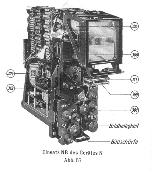 What both have in common - is that these carry the designation 'NB Gerät', further there is little similarity, but both carrying two CRT screens. However, this latter statement, we will notice in chapter 3, isn't correct. This emphasises what the module designation were about; it meant their purpose. The NB modules did have two CRT screens, of which the top one provided the overall measuring range (full range capture) and the lower one displays the accurate range reference marker. Normally, as we can see below, a NB module being just adjacent to the calibrated delay-line (Messkette) or within the N Gerät. But, we will also learn, that in some applications an NB like module being operated separately. This is being proved in chapter 3.