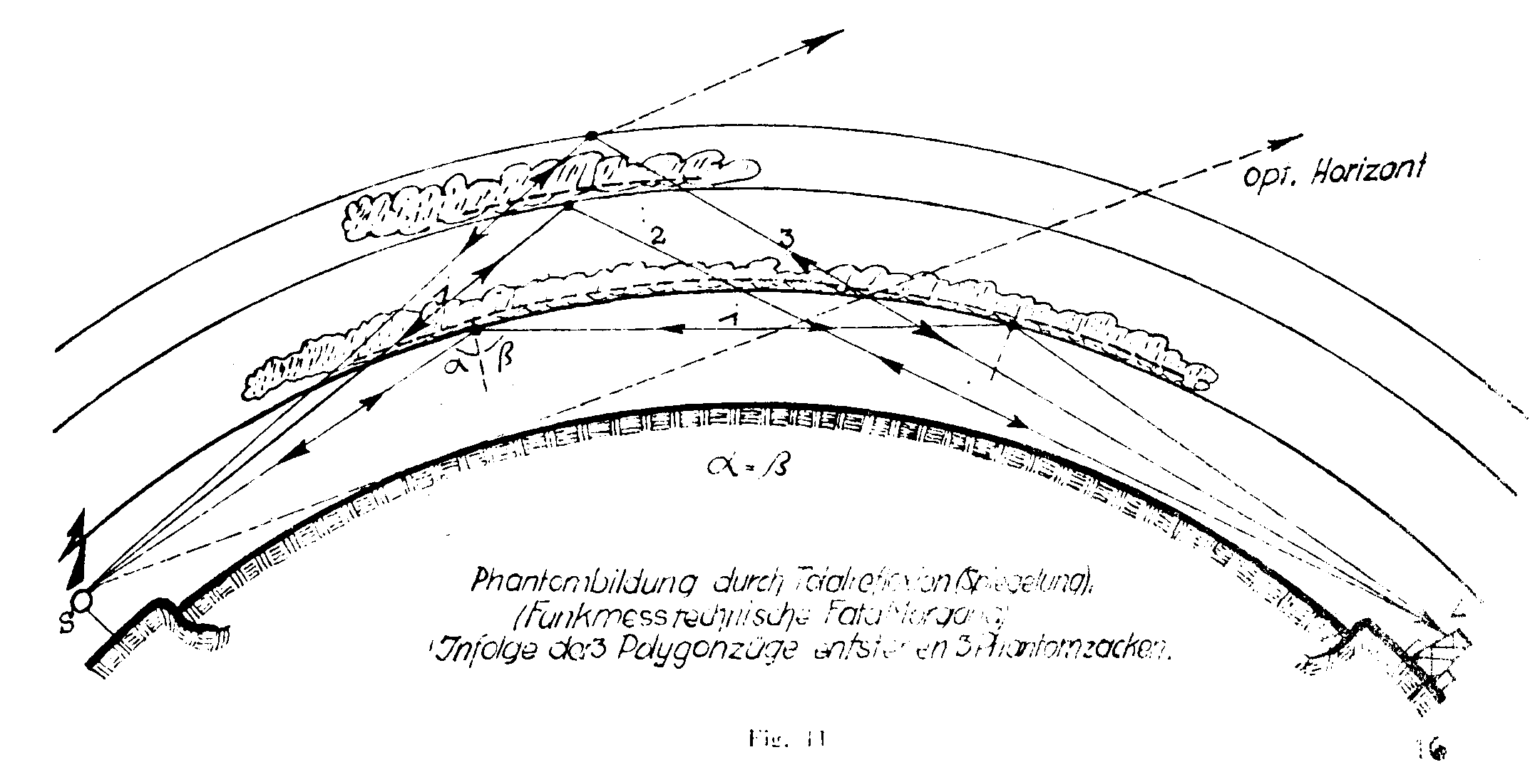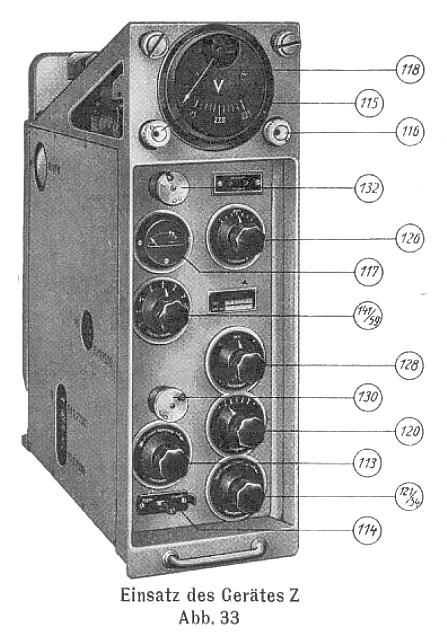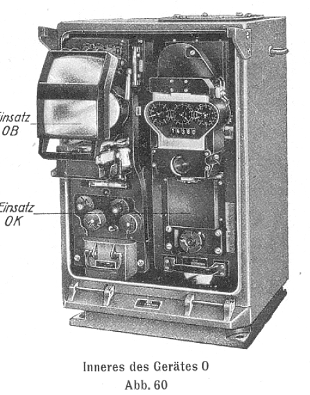 ... Die Zeitlinie wurde horizontal mit einer Sinusspanning geschrieben. Die Auslenkung des zentrisch in Bildschirmmitte eingestellten Leuchtpunktes nach links und rechts erfolgte direkt mit der Tongenerator- Summerspannung (later known as Z-Gerät, AOB), die in einem Ablenkstrahlverstärker auf einen solchen Wert gebracht wurde, daß sie den Kathodenstrahl nach beiden seiten weit über den Rand des Bildschirmes auslenkte. Der auf dem Bildschirm sichtbare mittlere Teil der Schwingung um den Nulldurchgang war hinreichend gerade für eine lineare Teilung der Entfernungsskala. Mit einer speziellen Schaltung wurde erreicht, daß der Strahl nur im Vorlauf hell war; der Rücklauf war dunkelgesteuert. ...