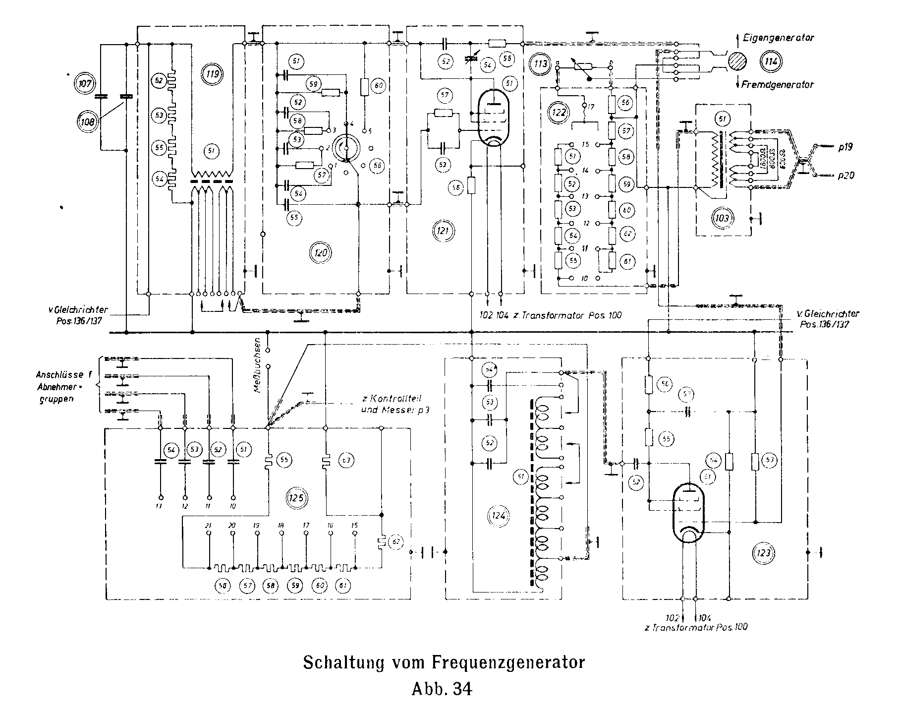 Please bear in mind, the Kippspg-Erzeuger (Kippspannungserzeuger). To be translated in: deflection-voltage-generator. Kippspannung is mostly linked onto saw-tooth signals. Though, GEMA relied upon a different technique; they applied sine-waves. What they did, was using the particular part of the sine-wave where the up- or down wards going slope being considered sufficient linear. They did blank, however, the downwards going sine-wave slope. With this technology being dealt with further down on this webpage, we will learn, nevertheless, that the NVK NB apparatus used for deflection of the upper CRT indeed a saw-tooth signal.