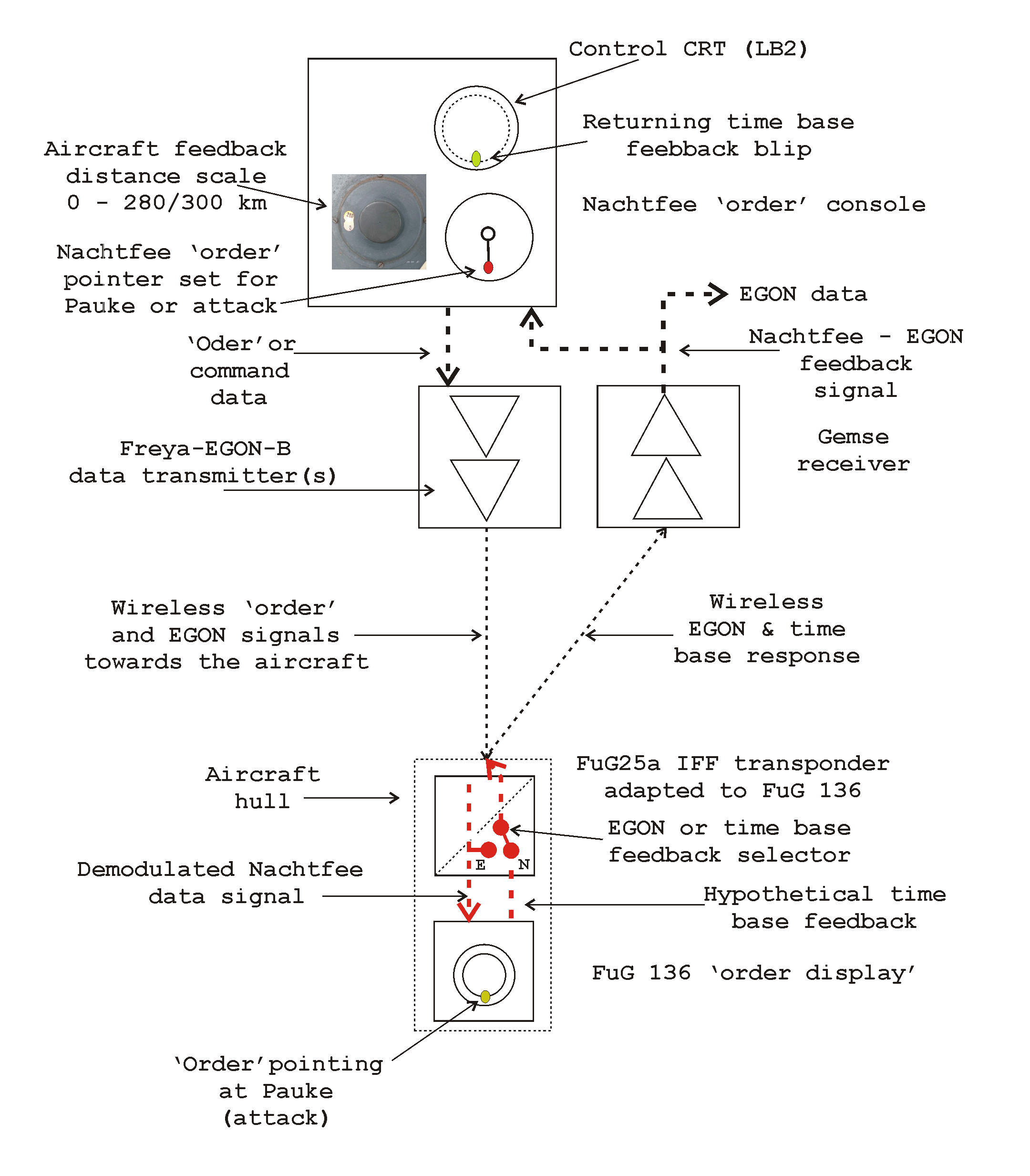 What is foremost wanted, although, nowhere being mentioned: the Nachtfee system has to rely upon a two way 'signal phase' information exchange. I refer to what I call the 'TB' signal originating from the time-base source inside the aircraft 'payload', conveyed (additionally) by IFF means towards the Nachtfee console; which was integrated into the so-called Freya-EGON system (EGON-B). This reference signal has to be understand acting in the 'time domain'. The Nachtfee system simply could not have worked without this elementary phase information feedback. A very strong fact supporting my perception, is the existence of the so-called 'Phase' control at the Nachtfee console front panel (down on the left-hand side of the 'order scale'). Which setting cannot be controlled by what ever means build-in the Nachtfee console. It only changes the time-base signal phase (Phase control A). But, because the rest of the following system is being operated in coherence, it is impossible to know what it actually is causing. It determines, however, the instant at which the 'command blip' appears at the aircraft order screen, without any notice of the ground control. In my understanding, the additional TB signal should have a system-related off-set, which additionally is painted at the 'LB2 control screen' (ground console). And should be adjusted upon by means of the ominous 'Phase' control setting and adjusting it at a certain vector off-set against N (North being the starting point at the 'order' compass scale adjustable at the Nachtfee front panel). Interesting, is, that the returning 'order' signal is responding in coherence - and the TB reference is acting not accordingly. Please bear also in mind - that the distance covered between the Nachtfee ground console and the (moving) aircraft is, of course, equal for both directions of signal transfer (towards the aircraft and returning to the ground station). For better understanding what the mutual implications are, please digest my PowerPoint presentation again (ppt converted into pdf)