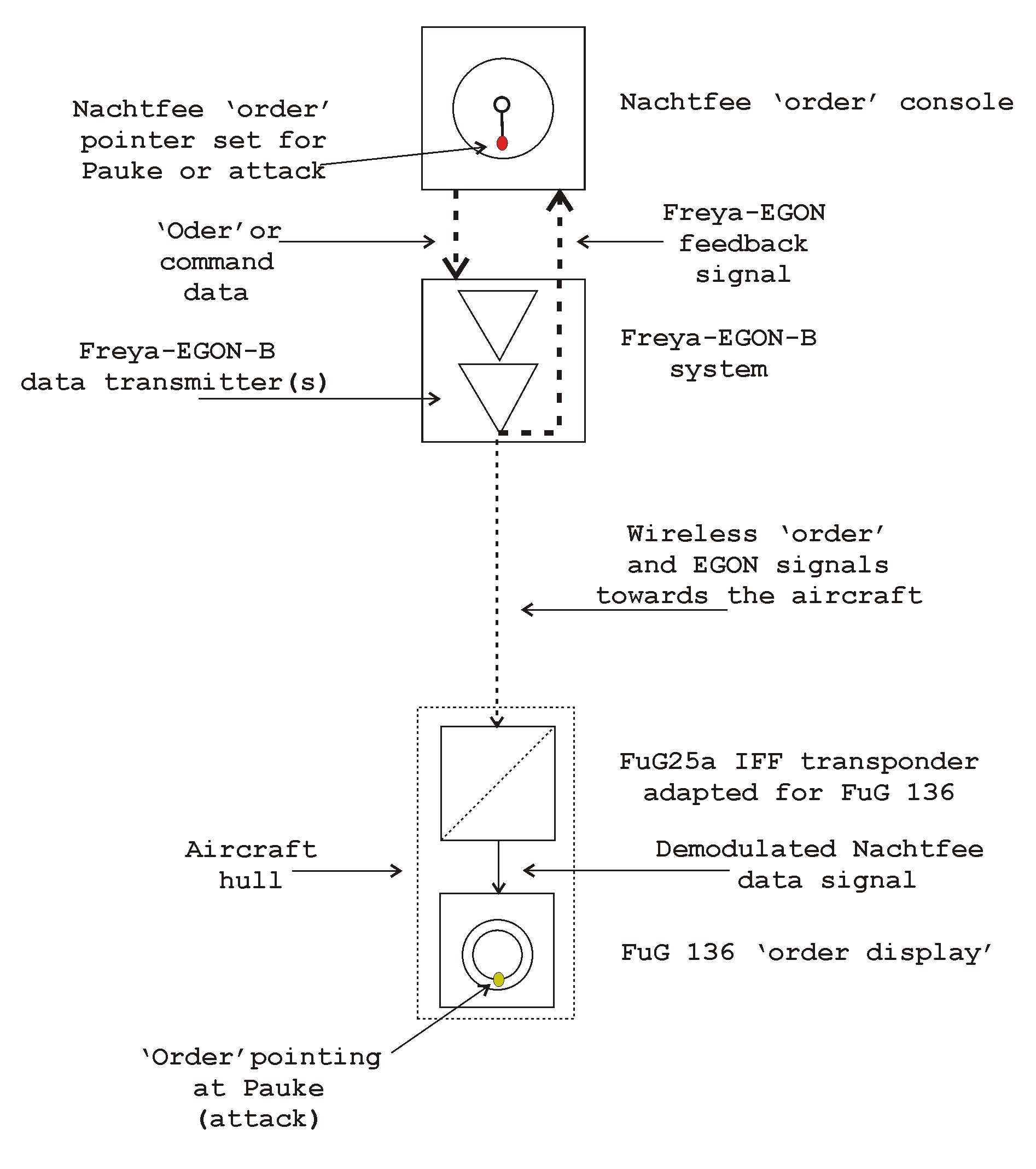 The information, however, 'Adjustable Airborne Presentation unit' may well have an implication upon our current survey. It has been found, that nearly all information in this drawing is having a relevant meaning. Does 'Adjustable' mean that the airborne operator had to keep synchronism between the Nachtfee on the ground and the local display in the aircraft manually? Also mentioning 'Switch for Receipting Messages' may tell us something. This may well indicate that the system was only activated after some flying time. In some respect I doubt this, because the 'Pathfinder' aircraft has to follow an exact trajectory, as to ascertain that a target is being approached in the shortest time possible. That is, in my perception, the most likely tactical meaning of a combined Freya-EGON station.