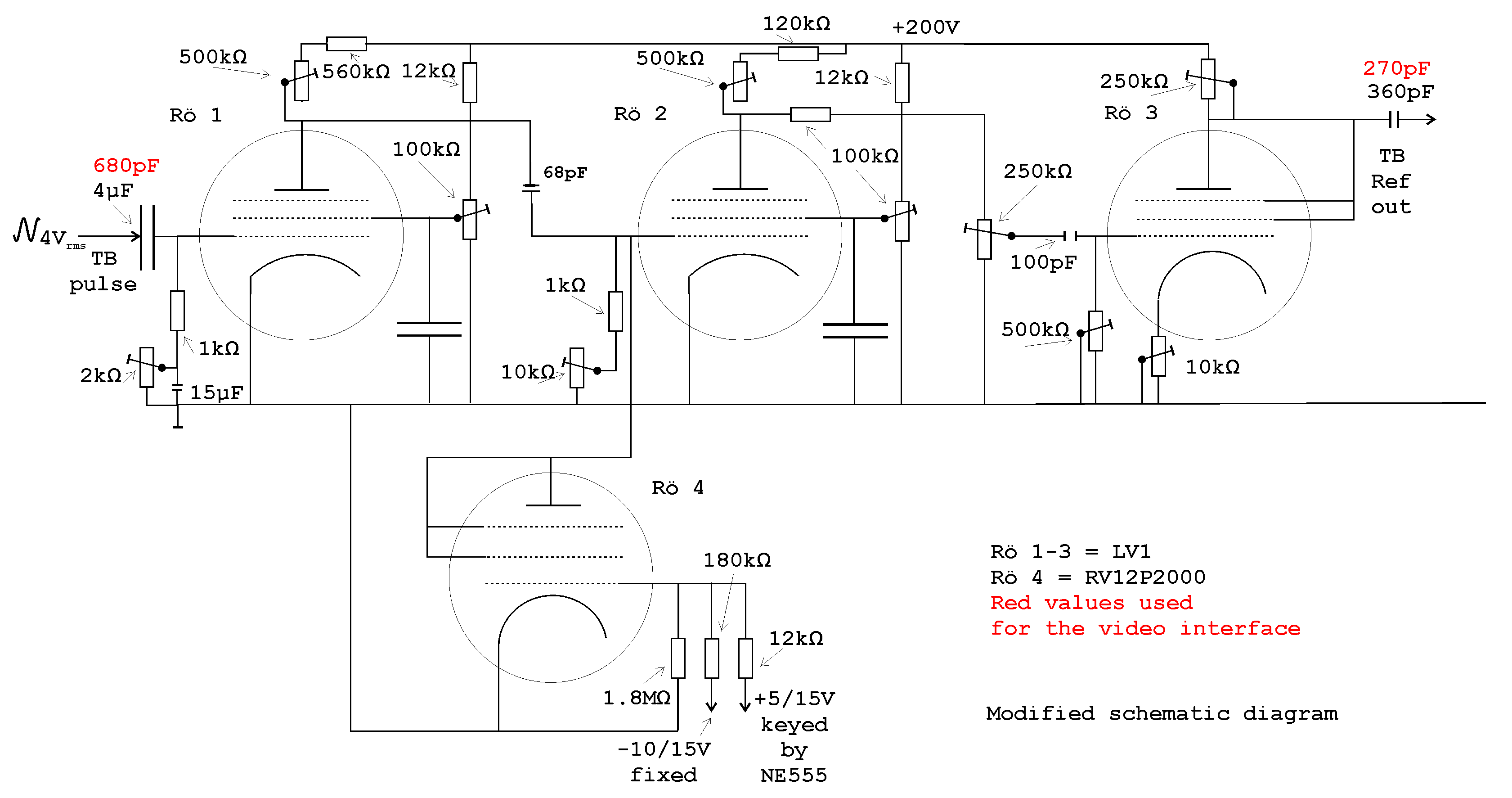 We still have experimentally replaced only the TB reference channel by a valves controlled circuitry. Though, we still operate a transistorised interface between the IFF unit and the Z-modulated scope channel. We may assume, that this channel will also reduce transient delays, which will go into the overall system alignment. A future concern is the implementation of TB blanking by means of a NE555 asynchron timer system. On the same time combining its circuitry with newly developed valve interface. For it I have two ideas - using the suppressor grid (g3) of the first or second valve stage or, using an additional RV12P2000 that blocks a channel somewhere in the signal line. The art is, finding a way without the necessity of using an additional negative voltage source.