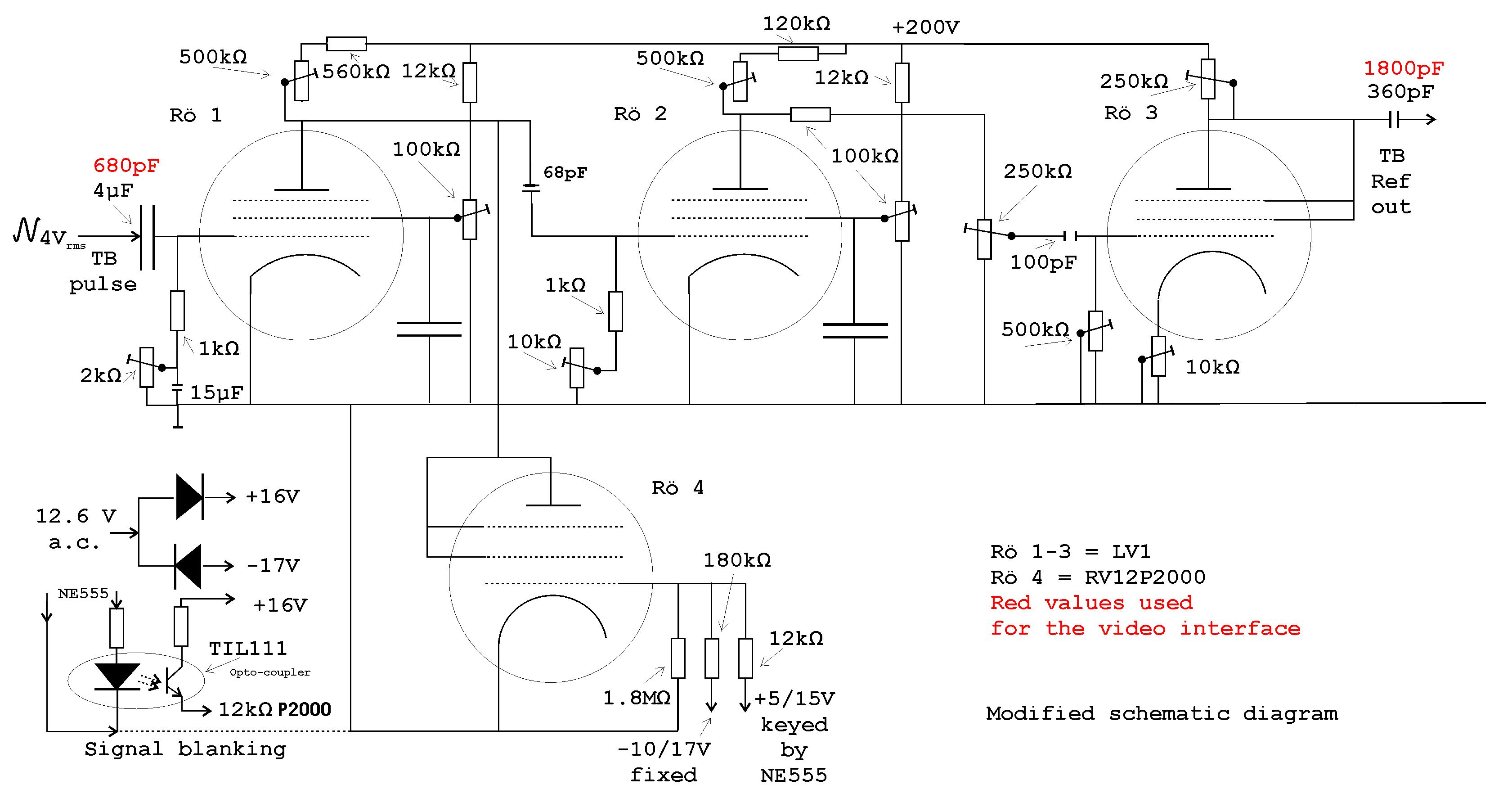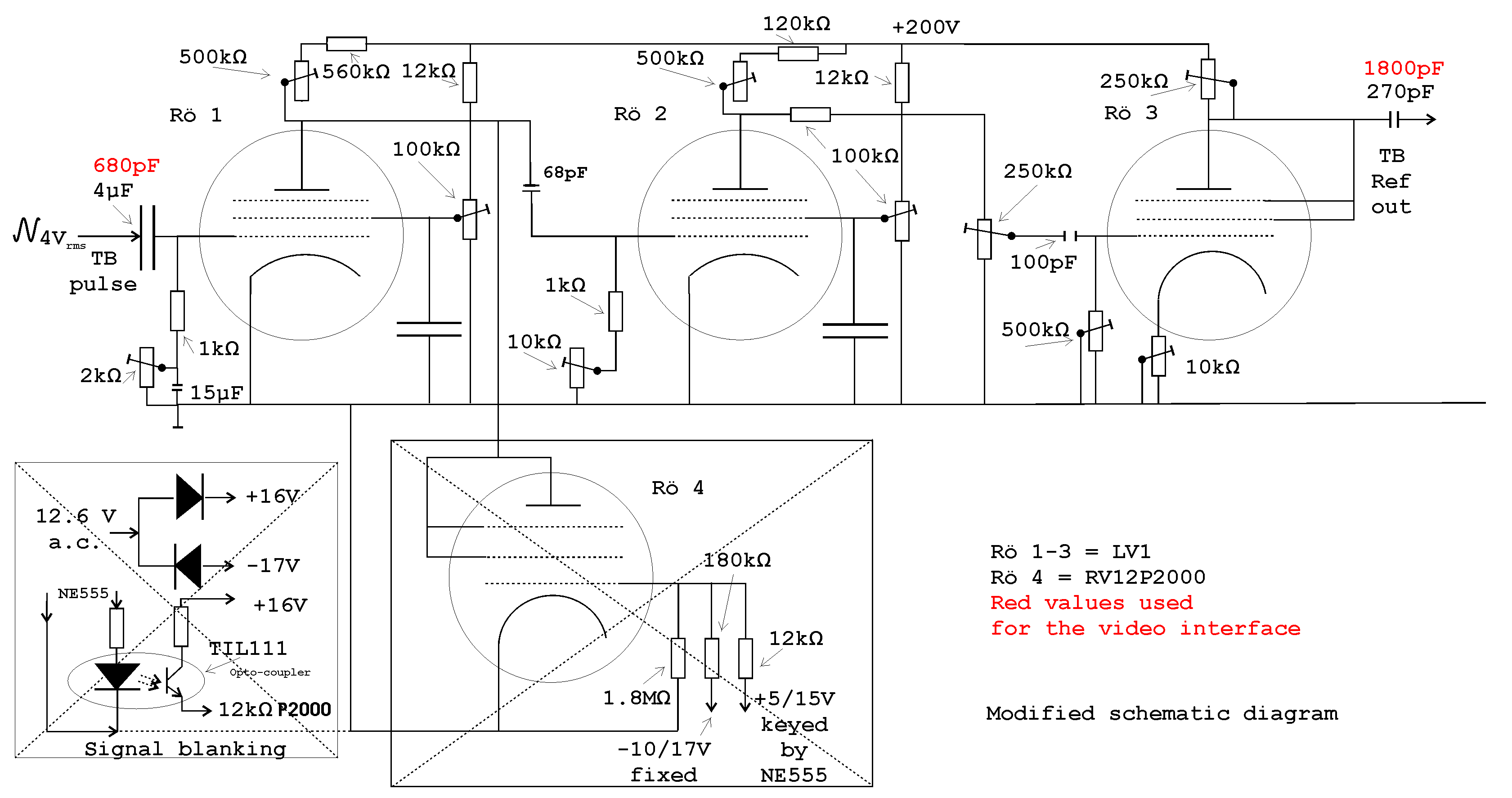 I have already prepared for a blanking facility (RV12P2000). As to keep it simple, I would like to operate the existing NE555 controlled timer switching circuit. Using its output to feed two TiL111 opto-couplers. By this means we possess an optimal galvanic separation between the valve controlled stages and the transistorised interface module. I know, of course, that this does not obey to wartime techniques, but it only constitute an auxiliary provision to get rid of the TB reference spot for the time being.