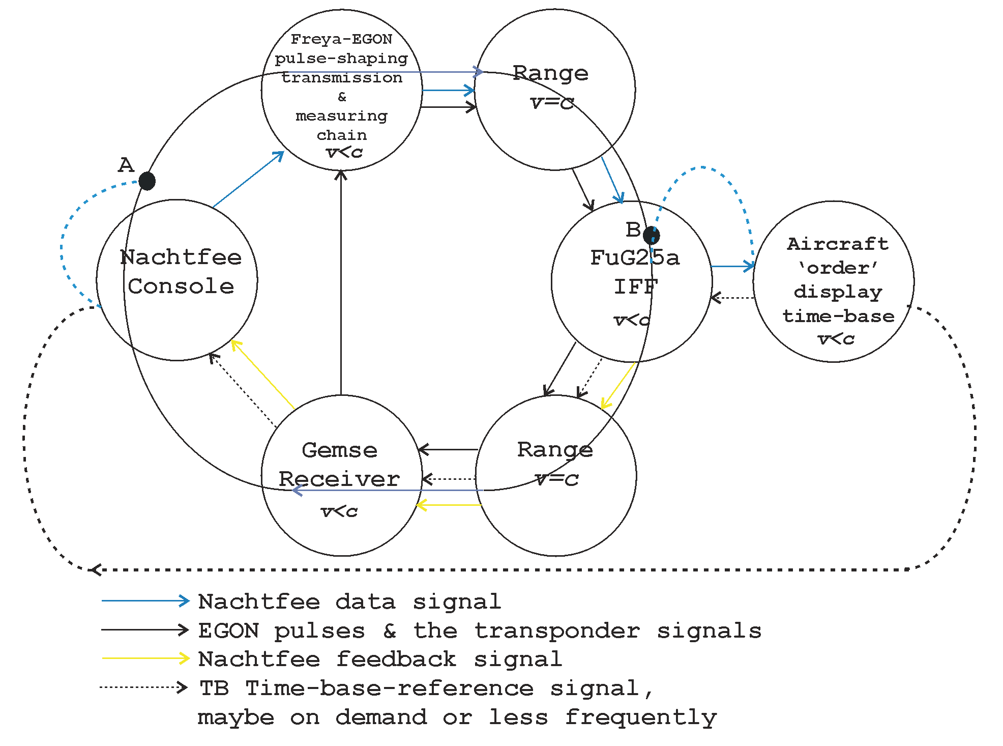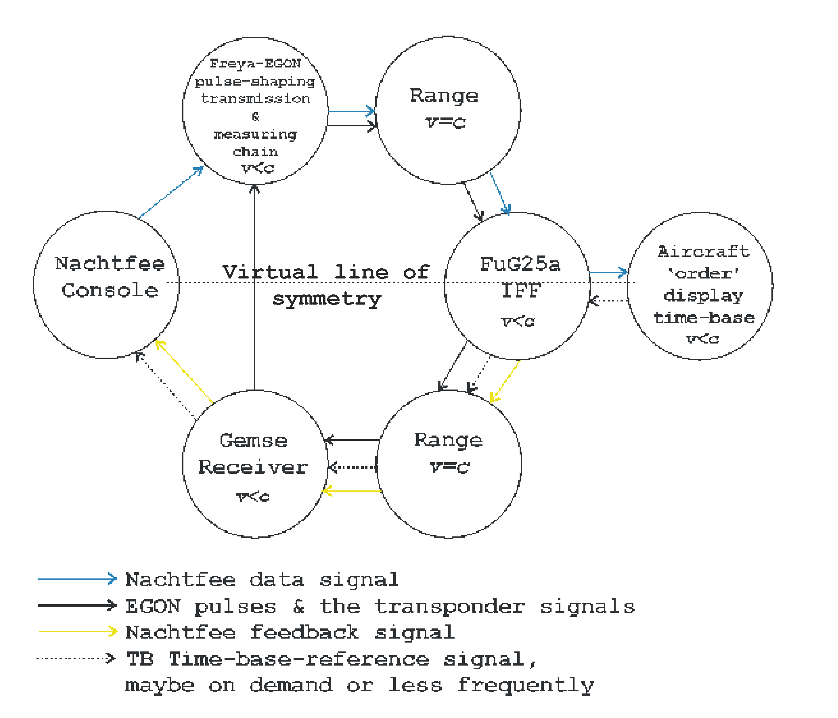 The simulated aircraft system being fed from our PM 5193 synthesizer, providing 500 Hz. This time-base signal-phase (TB) being conveyed towards the Nachtfee console and providing the only possible signal-phase-reference of the current status of the aircraft time-base signal versus range. (please notice further down also the system-loops)