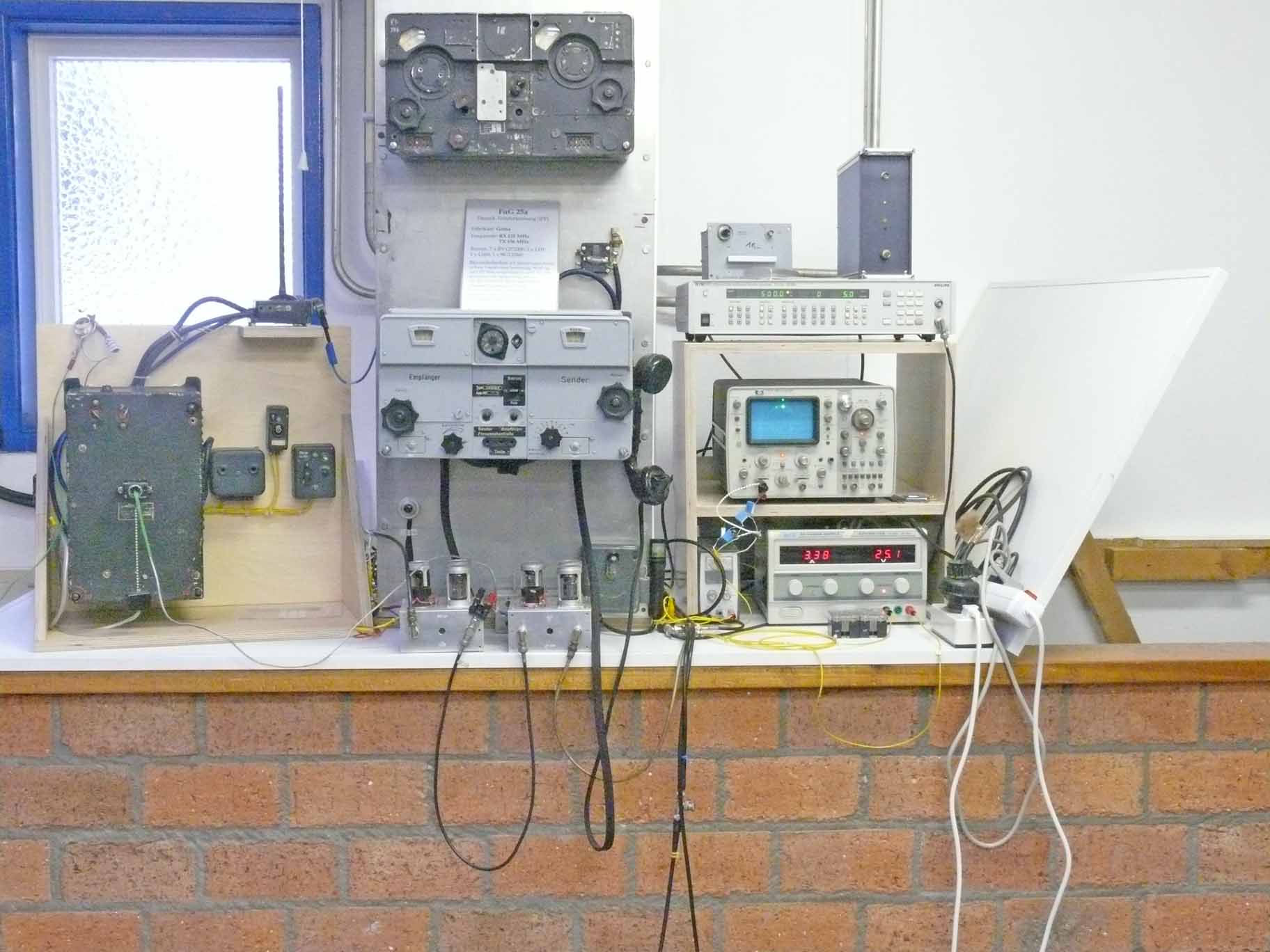Consisting of: on the left-hand side the complete FuG 25a - in the centre the two interfaces (my own design) on the right-hand side on top the Philips PM 5193 synthesizer and below of it the display scope. The circular trace is, like in wartime days, painted by means of a first order Lissajous. Below it the power supply to the FuG 25a system.