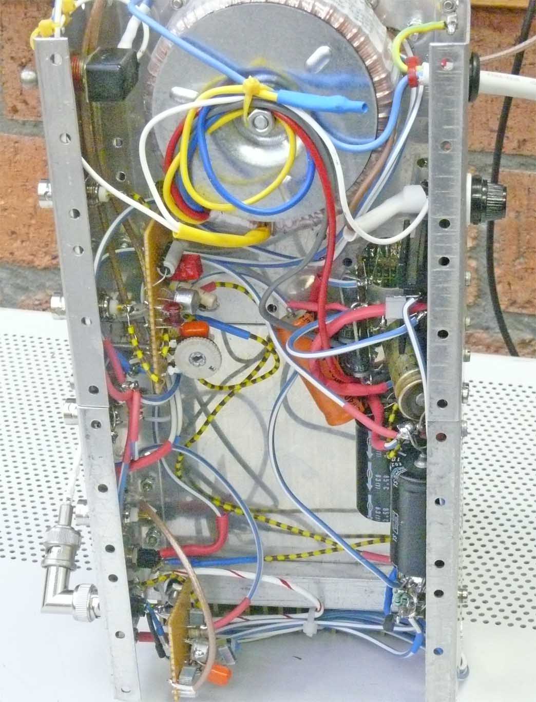 The purple twisted cable-wires carry the Rubidium standard signal (15000 Hz) onto G1 of quartz stage 1 (Q1)