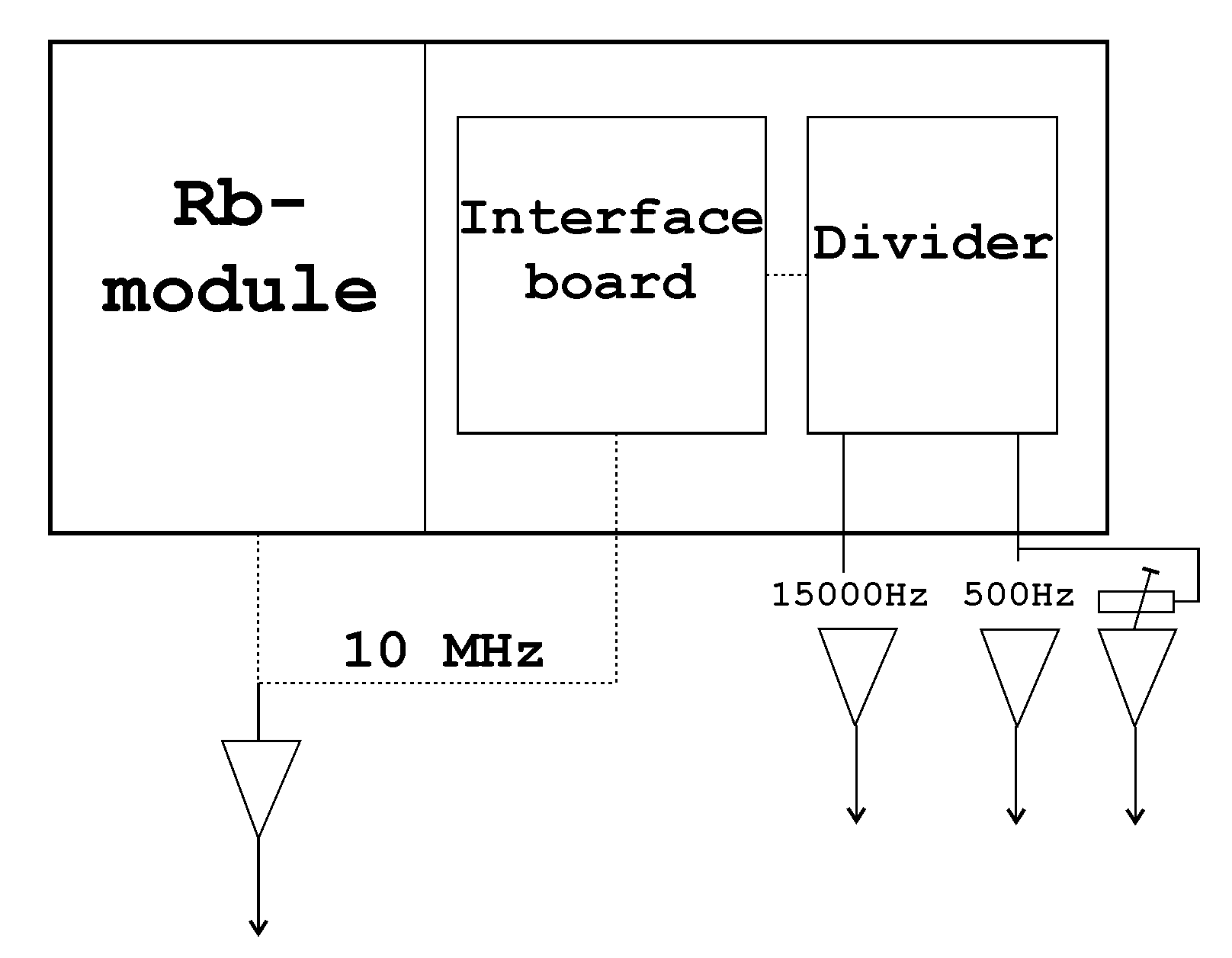 (neglecting the BNC cable originating from the Rb-module) 10 MHz - 15,000 Hz - 500 Hz and 500 Hz variable higher signal level (all sine waves).