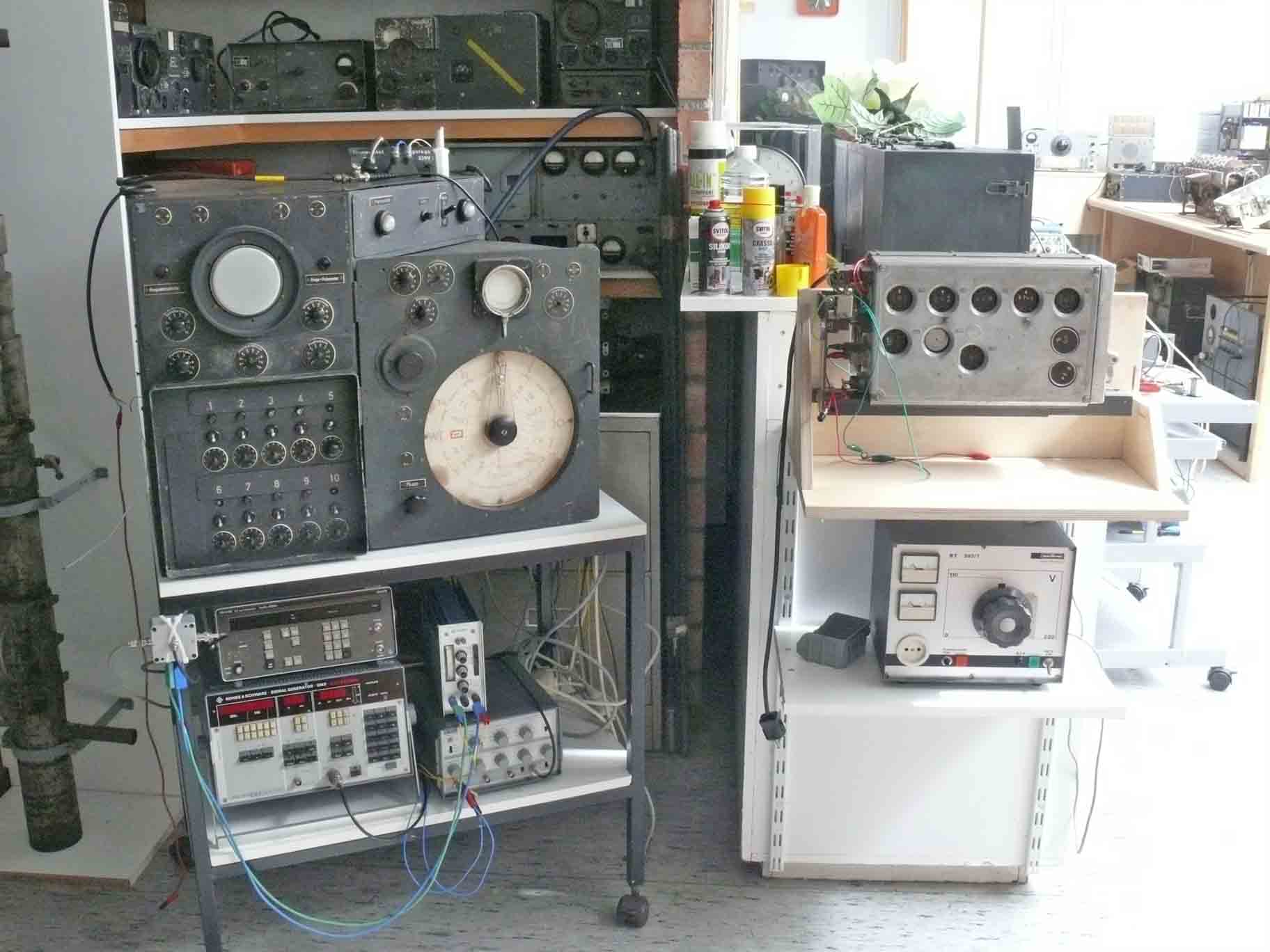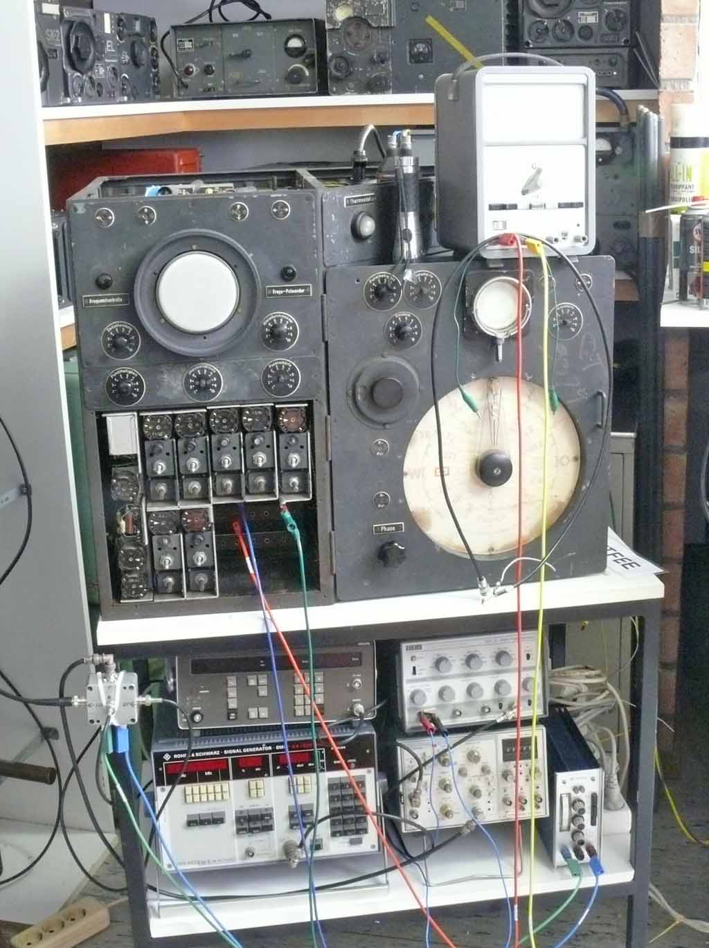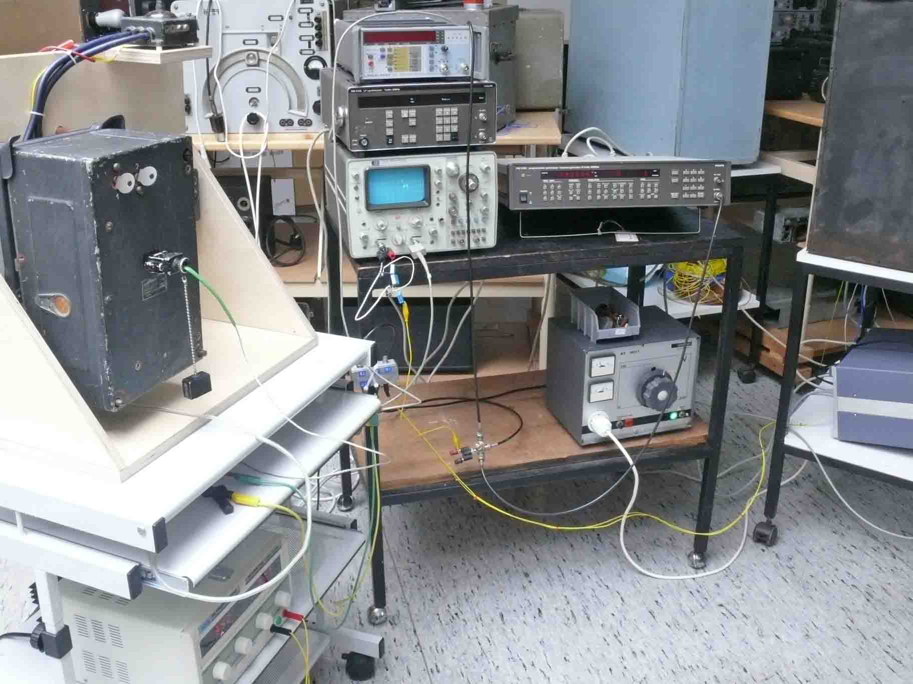 Just opposite the simulated aircraft system is now the simulated Nachtfee ground system. Below the Nachtfee unit the R&S HF generator which provides the 124 MHz signal. On top of it the Philips LF synthesiser PM5190X, which has to provide the simulated EGON signal (PRF = 500 Hz); also being "a thing to be done". Right of the R&S generator, the TTi pulse generator and on top of it a power supply (20 V). On the far right on top of the wooden frame: the GEMSE ground receiver code-name Gemse. Below it the Variac transformer, which main function is to separate the Nachtfee power-lines from our regular mains, preventing hazardous situations. It allows also the reduction of the our current European power-line voltage of say 235-240 V; whereas Nachtfee should be fed with 220 V (also separately the quartz thermostatic oven)