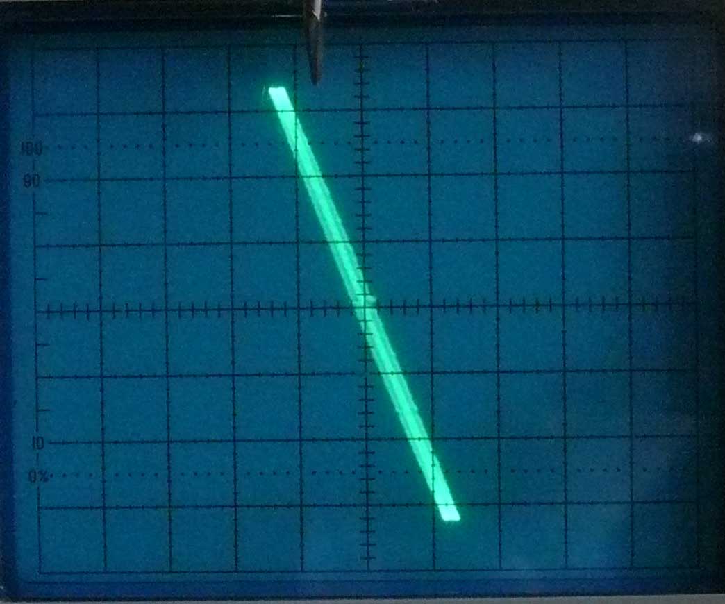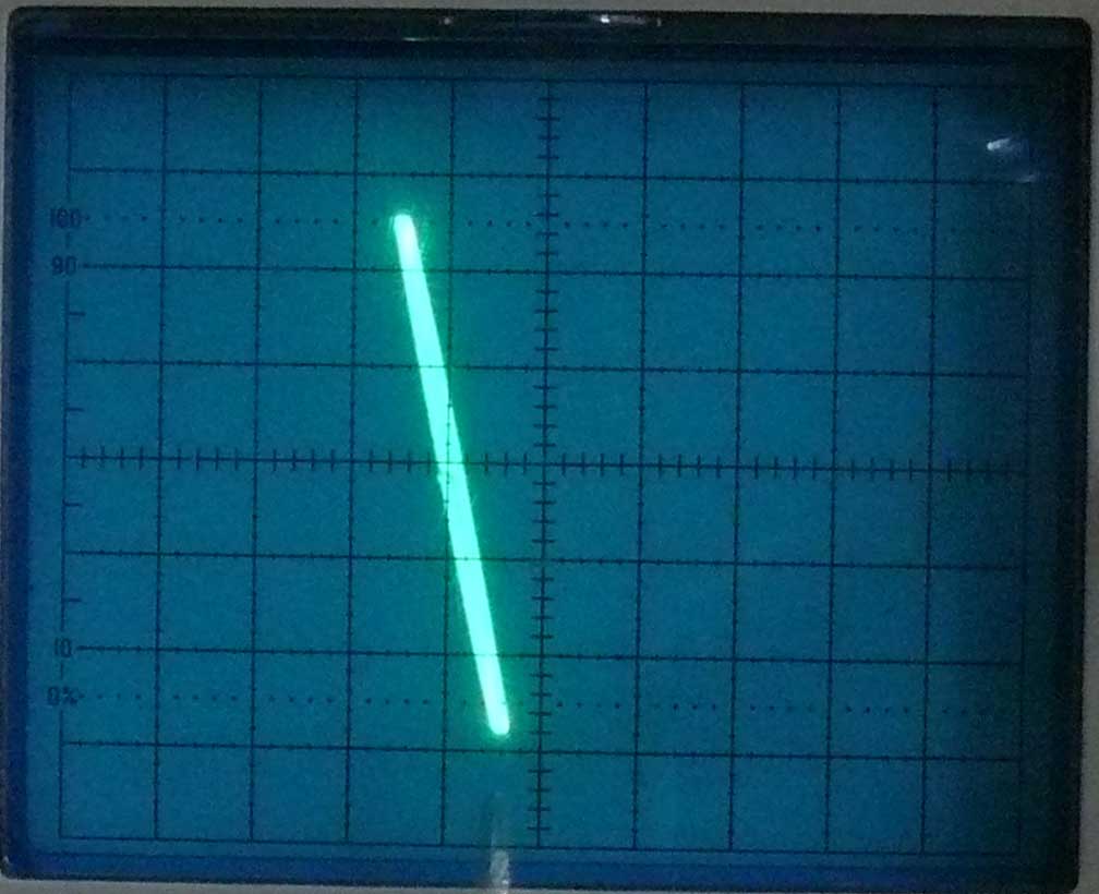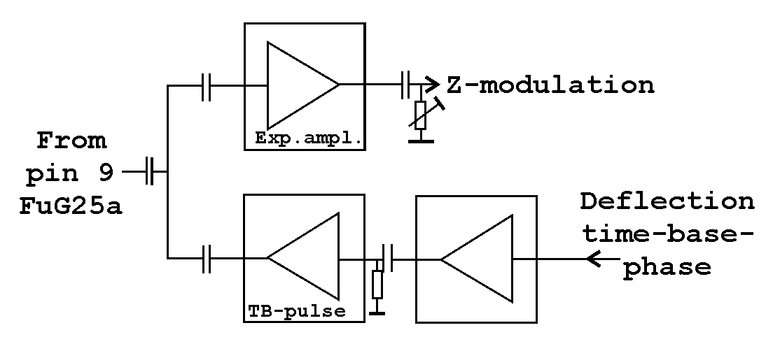 * Z-modulation is directly (dc like) influencing the brightness level of the painted trace. The painted Z-spot is seemingly bigger than the time-base trace because the fluorescence material is forced to emit (excitation) of the fluorescence material around the spot (a bit).