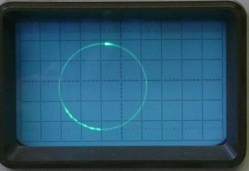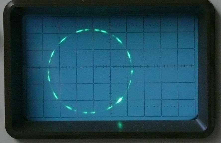 The 'order' blip is, in our case represented by a spot, because our signals are fed onto the Z-modulation* input of the oscilloscope used. It is exactly pointing due North. It might seem that I incorrectly have divided the window vectors. This isn't the case, as I used an 'order' compass photo in the background during the vector sectors were drawn. At the end of the process I deleted the photo and the drawing was what left