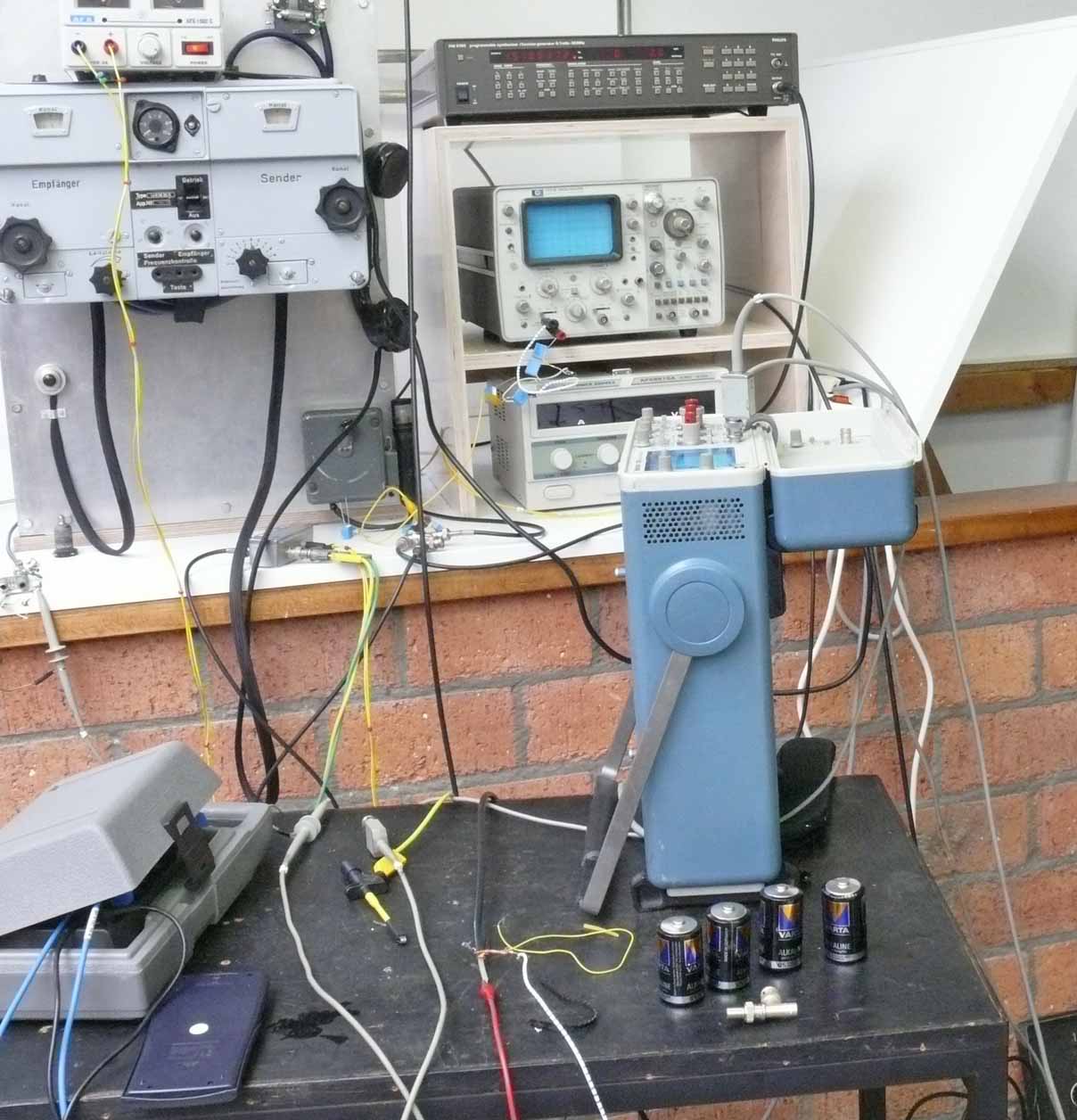 On the left-hand-table leg we see the modified HF modulator, where an additional BNC connector is added; implementing in the system a second signal component, originating from the (simulated) Freya-EGON system. The 500.0 Hz signal indicated at the upper synthesiser (PM5190). Its sine-wave is then fed onto the newly obtained Tektronix pulse generator PG508. Its signal output is then gating the EGON (HF) signal component. The centre BNC is connected onto the TTi pulse generator which is handling the Nachtfee signal.