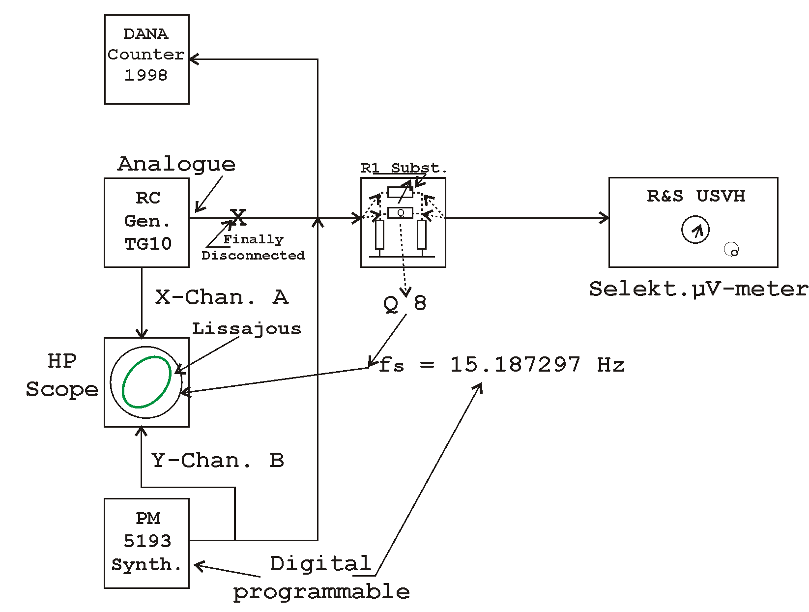 I also undertook again stability tests and it is found that after > three hours of operation, the Nachtfee deviated against the synthesiser PM5193 up or down 0.0002 Hz. Seemingly a very low drift, but still too much in my perception. It might have been much higher under wartime operational conditions. This 0.0002 Hz may be regarded a kind of mutual time-base deviation bandwidth. Experiments were carried out under quite favourable conditions, within a more or less constant room environment. However, seemingly stable but after a while not tolerable phase drift errors occur; causing the Nachtfee 'order' painted at the simulated aircraft display pointing at an entirely faulty vector. One have to think of: start action whereas 5 degrees left is meant!
