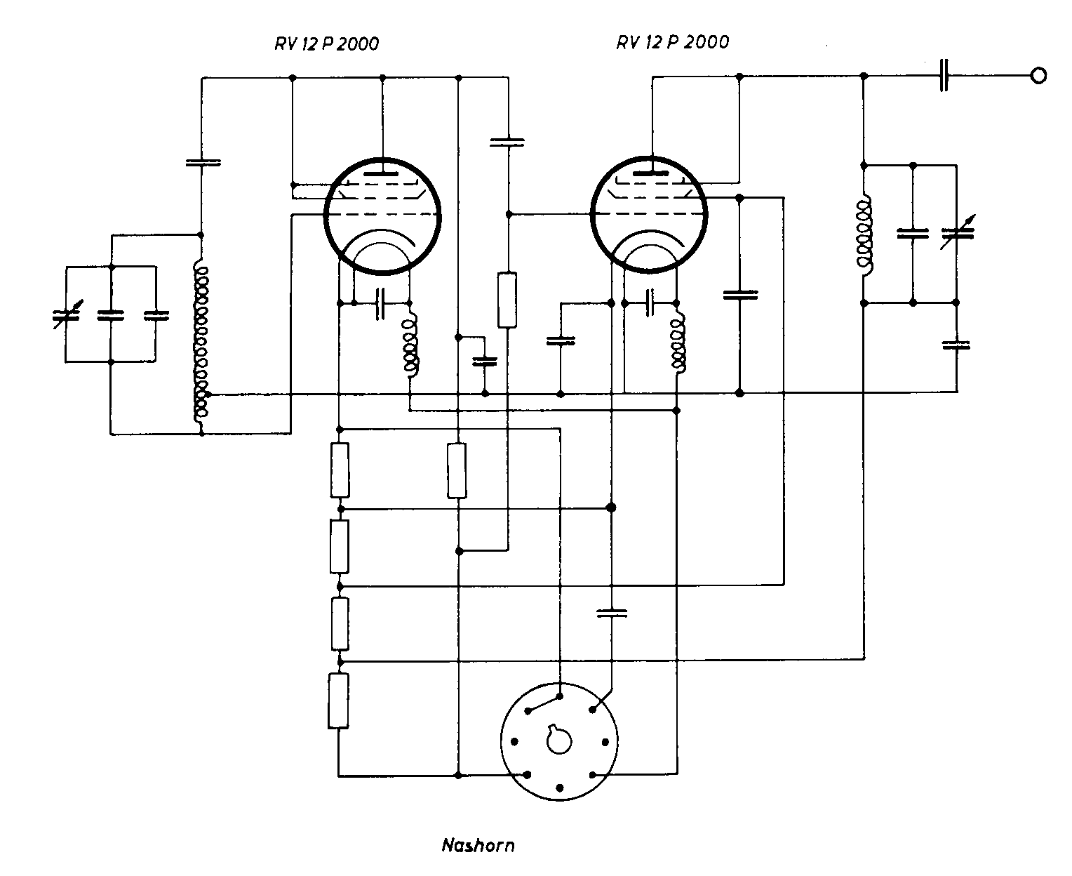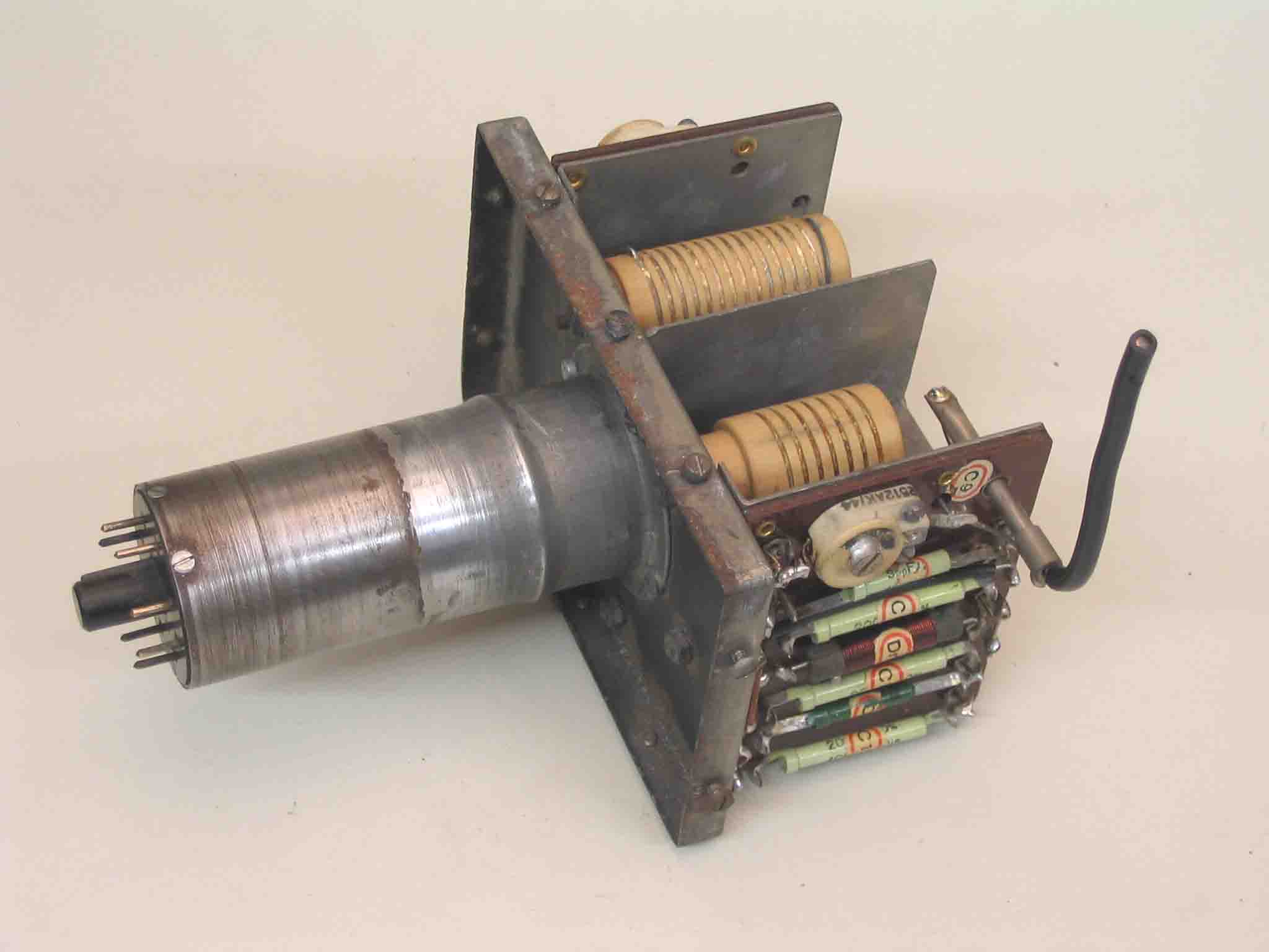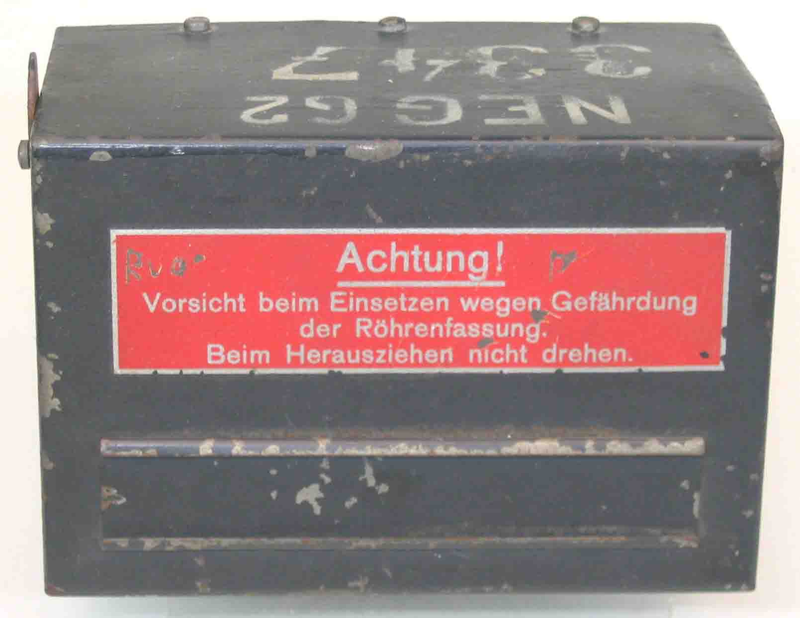NEG 62 in position. The third step is: to activate the automatic fuses (AF buttons 1 - 3). The two lower fuse buttons 4 and 5 respectively could activate the - 2700 and + 8000 volts supplies. The pulses at g1 of valve 4 triggers (see Na-Liste last paragraph) the oscillator circuit of NEG 62 (see details below); CR is part of the fine-range crank of EAG 62 (regard for details my book Deckname Würzburg); CC is pointing to the coaxial-cable-input of the intermediate amplifier ZFV 62 (box with red K) and the small antenna radiator of NEG 62 (inducing so a small amount of energy into the IF amplifier); CR Tube LB7/15 (Opta) is for checking either the transmitting pulse (Tastimpuls) or the receiver blocking pulse (Sperrimpuls). During operation it is normally switched off; TL is the output for: Tastlaus (pulsed coherent signals, like Tastlaus or Pulsed-Doppler detection, etc., regard Deckname Würzburg); FC is the flat-cable interconnecting the main panel with the displays for: fine ranging EAG 62 and coarse measuring ANG 62. Regard also: Würzburg set-up (new)