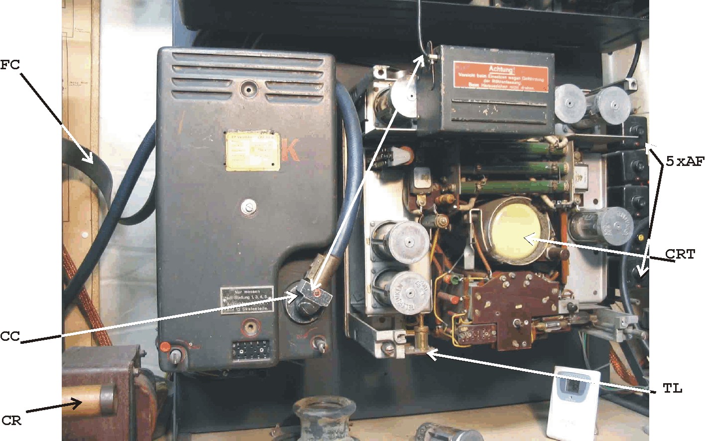 This photo is copied from the Rehbock contribution on this website. For us relevant is: the position of TP (transmitted radar pulse) versus the engraved range-scale (for details see Deckname Würzburg page 10). The circular time base-line is generated in a resonant power amplifier. The two deflection yokes are both in resonance, though, with a phase difference of 90° at 3750 Hz (PRF). The nature of this circuit does not allow directly accurate phase fixing (in the time-domain, at what angle the rotating light spot actually is). TP could deviate into either direction. As the time base has to be in accordance with the engraved range-scale, it is obligatory to check the correct position of TP regularly.