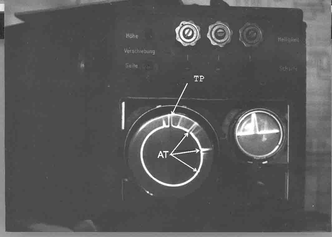 The position of the slope of the transmitting pulse (Nullpunkt) at the circular time base (TP, see below), determines the accuracy of the Würzburg coarse range finder. The range-scale is engraved inside the (flat) glass screen of the LB13/40 CR tube in the ANG 62 display unit (equally in all Würzburg radars since about mid 1942; FuSE62 / 65 - FuMG62 / 65 sometimes known as FuG62 / 65)(65 = Riese- or Giant Würzburg).