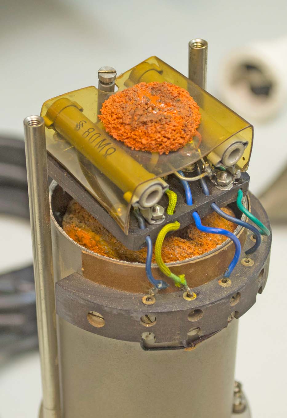 Metal microphone cover of the 'Belgium gift' is removed, and the accompanied modification being visible