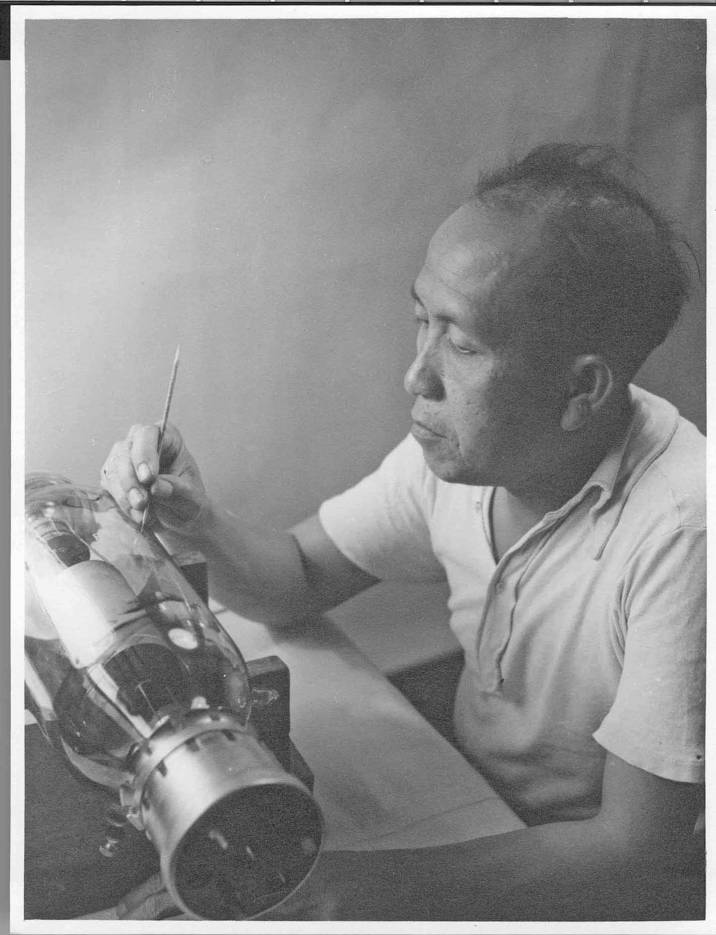 This scene is doubtless showing an unique process. Repairing (valuable) transmitter valves could be more or less easily accomplished as long as these valves relied on tungsten filaments. Oxide cathodes necessitate a far more complex processing and was not cured in Bandung!