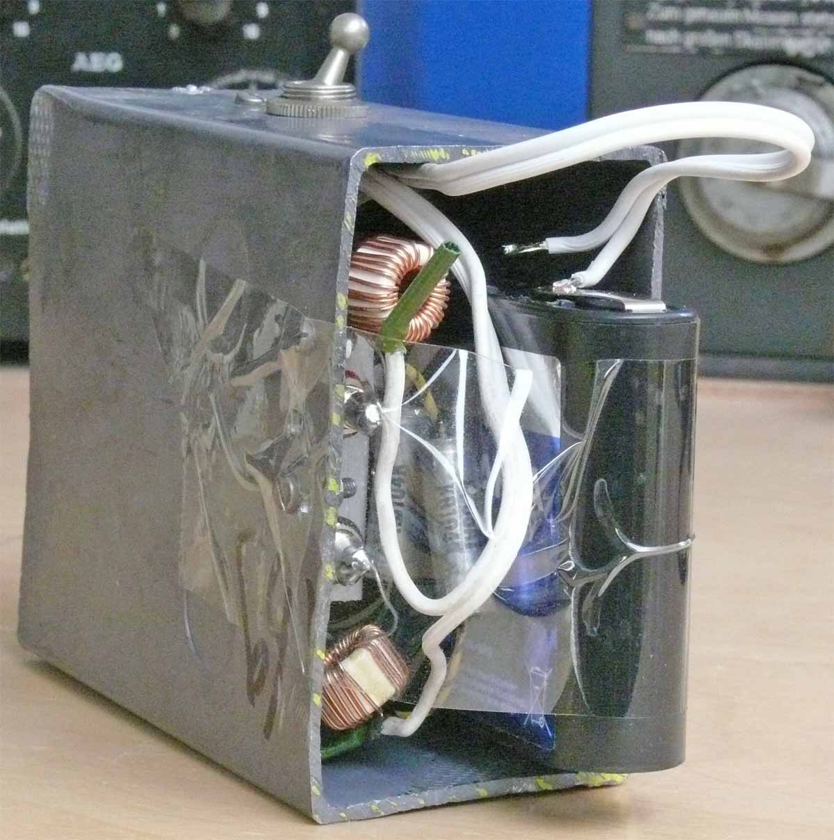 Viewing one side of the experimental Puck imitation. On the right hand-side the rear opening with a 'flat battery' well known for old continental torches. The filtering is implemented as I encountered high levels of spark interference, when the spark device being fed from a separate power supply; likely owing to radiation from the feeding cables