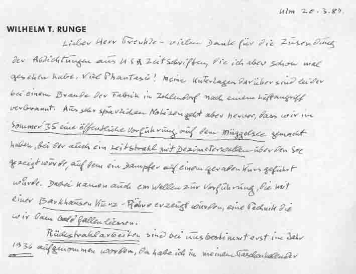 First, that according to Runge’s reminiscence, Telefunken started working on radar about 1936. Consequently, not much earlier.