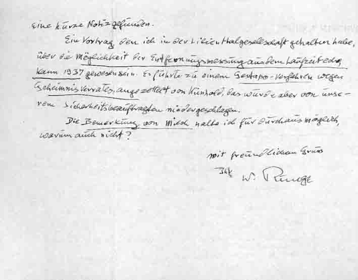 Ein Vortrag den ich in der Lilienthalgesellschaft gehalten habe, über die Möglichkeit der Entfernungsmessung aus dem Laufzeitecho, kam 1937 gewesen sein. Er führte zu einem Gestapo-Verfahren wegen Geheimnis Verrates, angezettelt von Künhold, das wurde aber von unserem Sicherheitsbeauftragten niedergeschlagen.