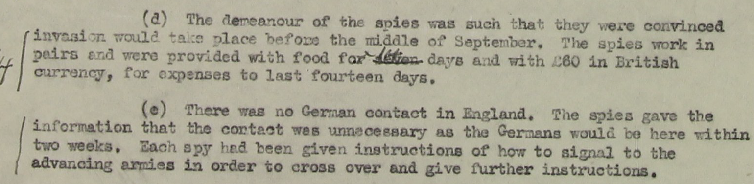 Quote: (d) The demeanour of the spies was such that they were convinced invasion would take place before the middle of September. The spies work in pairs and were provided with food for ten(?) days and with £60 in British currency, for expenses to last fourteen days.