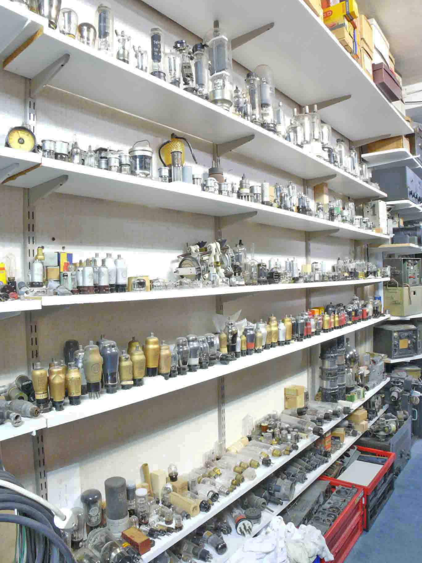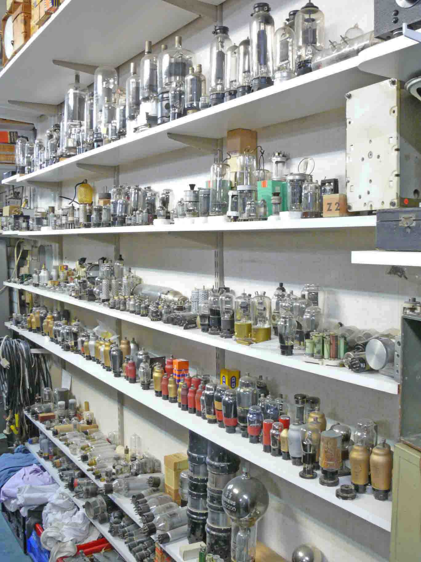 Our valve collection seen from an opposite perspective. The white ceramic box on shelve number 5 is the LO (local oscillator) belonging to FuSE62A (Würzburg type A). On our introduction page its internal structure is shown (photo on top on the right-hand side).