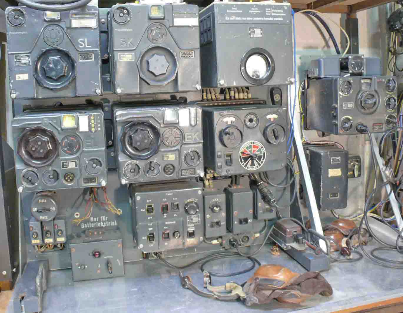 On the left the upper shelf: WIQ long wave version 90-720 kHz; U10E; S10K2; LGW (Siemens) gyro compass to K-12; FuG16 receiver module; FuG16ZY (facilitated with Y-mode (see Navigational aids); Umformer U8 (rotary generator); Power supply to Y- ground systems; far left U17 rotary generator to FuG16 and FuG17 aircraft systems