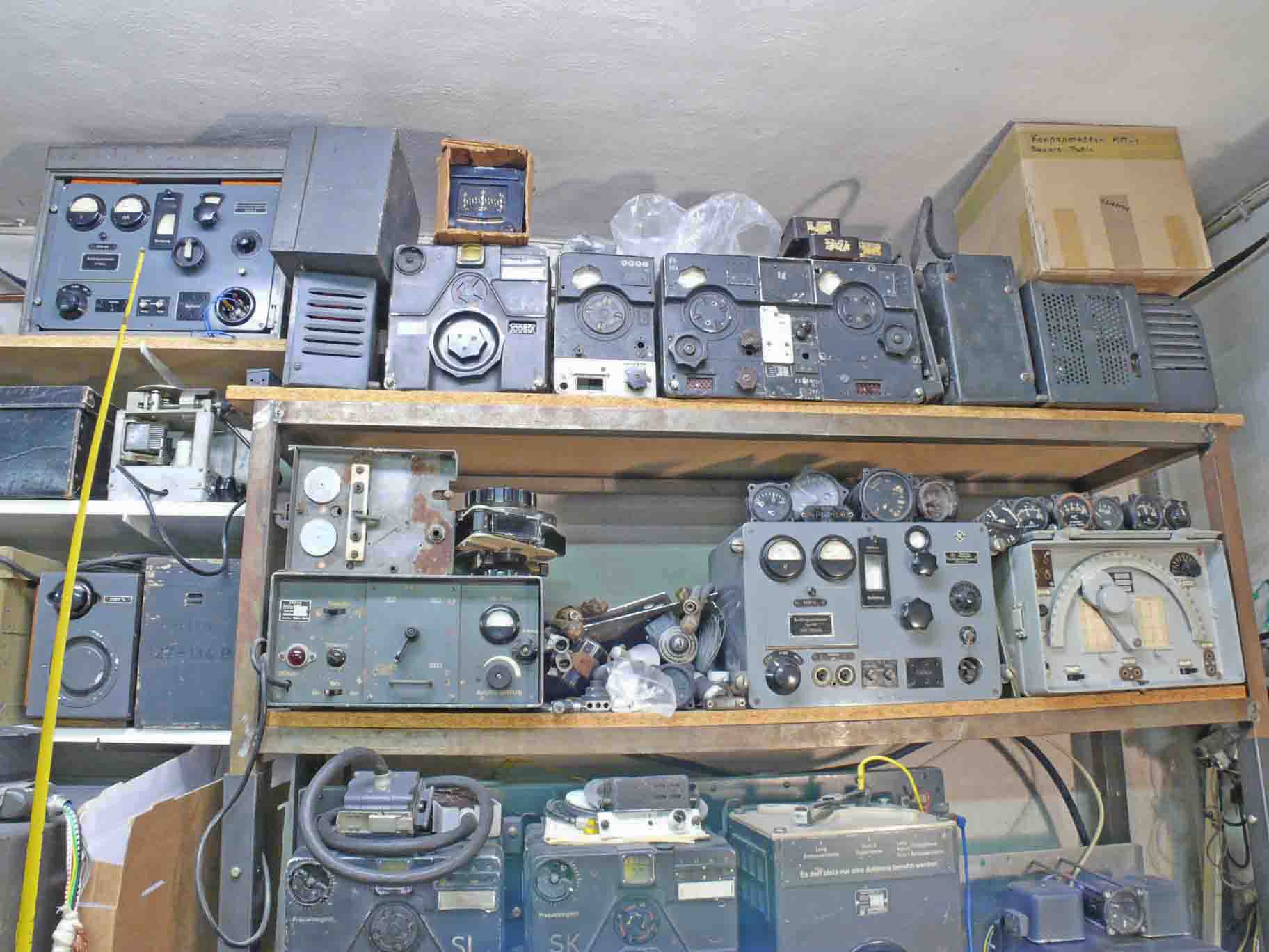 First shelf far left: Umformer U.O. 24 V dc -220 V ac convertor (used for servicing aircraft in the field; box to Libellenoktant 127-134b (astronomical navigation instrument); P.S.U.o.B test set to the Lorenz blind approach system (which could be operated by means of the voltage converter U.O see previous info); R&S (PTE) WIQ 1500-12000 kHz (see Na-Liste); on the far right PQK.2 (Prüf Quarz Kontrollgerät)