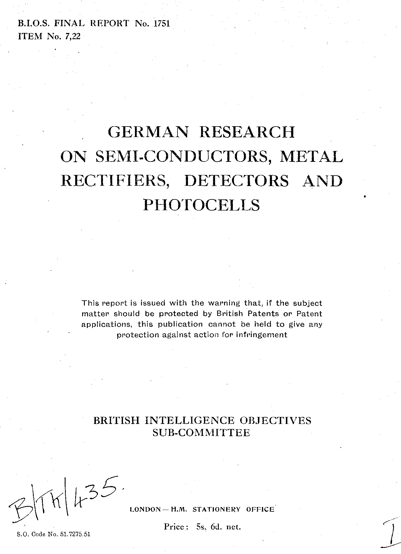 Keywords: Object of trip; List of those interviewed and their engagements; Prof. R.W. Pohl Chief of the first Physical Institute at Göttingen - AlkaliHalide Crystals, Colour Centres and Light Absorbtion; By diffusion of one of the constituent elements into the crystal .. ; By direct introduction of electrons into the crystal .. ; By the exposure to X-Rays ..; Theory of colour centres .. (Störstellen); F'Centres .. ; Effect of hydrogen .. ; Absorbtion Bands due to Impurities .. ; Electrical Conductivity of Solids .. ; Photo-chemical effects .. ; Super-Conductivity .. ; Resistances for Wireless Sets ... Prof. Schottky consultant to Siemens & Halske is mainly in the development of the theory of contact rectifiers .. ; Prof Brill of I.G. Farben (Oppau near Ludwigshafen and T.H. Darmstadt .. ; Electron density .. Valency .. ; Dr. Krebs a chemist by training with I.G. Farben .. Crystal Structure of Se .. ; Addition of Impurities .. ; According to Schottky's theory .. this furnished information on the distribution of impurity centres in the barrier layer .. ; Dr. C. Bosch of the A.E.G./F.I. (AEG) (Research Institute) .. ; Dr. F. Waibel physicist with Siemens & Halske .. ; Prof. P. Günther physical chemist of Königsberg and Breslau University, now with Siemens . .. ; Synthesis of Pyrite Crystals FeS2 .. ; Pure Silicon Crystals SiCl4 ...melting point (1420° C) .. ; Dr. König previously of T.H. Danzig, now at Göttingen University .. ; Prof. Frerichs of the Kaiser Wilhelm Institute, Berlin-Dahlem (KWI) and T.U. Berlin-Charlottenburg has been working for the Osram Studiengesellschaft ... ; CdS Photo-Conducting Cell .. ; TlS Photo-Voltaic Cell .. ; Dr. M. Treu was assistant to Prof. Gudden of Erlangen University .. died in 1945 ; Dr. Schaffernicht of A.E.G. (AEG) Valve Works Claustal .. ; Image Converters using Photo-Conductors .. ; Dr. J. Kaspar a physical chemist with the A.E.G. ... ; Johnson Noise .. ; Dr. H. Gaertner now with the Bizonal Economic Department at Minden during the he held a responcible position at the Heeres-Waffen-Amt, Berlin in the Department for Optics and Measurement .. ; Dr. Veith formerly A.E.G. (AEG); Herr Schmalenberger formerly Reichspost-Forschungsanstalt Berlin Berlin-Reinickendorf now engaged by the Russians in Berlin; Dr. Fenner formerly Reichsost-Forschungsanstalt .. ; Dr. Allekotte formerly physicist in Heereswaffenamt (HWa) Berlin Charlottenburg; Dr. Lotz Berlin-Siemensstadt Forschungslabor .. ; Dr. Plesse formerly Zeiss Jena now working with Zeiss Opton?? . ; Prof. Dr. M. Czerny Frankfurt a/M Physikalisches Institut der Universität Robert Mayerstrasse 2..; Dr. Kutzscher formerly Elac Kiel .. ; Dr. Treu formerly assistant of the late Prof. Gudden Prag ..; Dr. Casper formerly A.E.G. (AEG) Forschungsinstitut Berlin-Reinickendorf now perhaps Konstanz Bodensee (French Sector, AOB) .. ; Dr. Rein formerly I.G. Farben Werk Mainkur Frankfurt-Fechenheim ..; Prof. H. Kallmann of the KWI .. ; Photography by Neutrons similar in principe to X-Ray photography ..