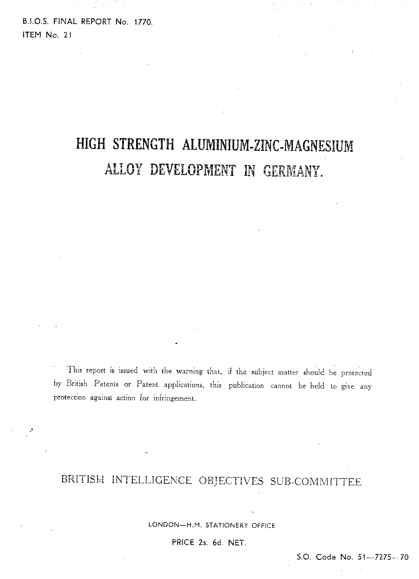 Keywords: Wartime Production; Composition; Casting of billets; Extrusion of Alloy, Rolling Sheet; Riverts, Forging, Heat Treatment; Stress Corrosion, Exposure Tests; History - Production I.G. Farben V.L.W.; Flw 3425 .. produced by I.G. Farben and V.L.W. .. Flw 3415 .. ; Prof. Bollenradt said that D.V.L. had research the conclusion that .. ; Dr. Altwicker (I.G.) claimed that ... ; Wielandwerke ... ; Eloxal .. ; The main requirements of Specification Flw 3415 (March 1942 issue) ... ; The Main Requirements of Specification Flw 3425 ... ; Fliegwerkstoff 3415 (Note by Professor Max Hass, October 1946) .. Only about 100 forms of the "Fleigwerkstoff"Form 3415 have been printed and never has been officially issued. .. Fliegwerkstoff-Handbuch had been edited by the Technical Office of the RLM Fliegwerkstoff Al-Cu-Mg was equivalent to Fliegwerkstoff 3116 .. ; According to German opinion the English alloy Hanco contained 7-8% of zinc and 2 Mg with chromium as stabilizer contains too much zinc and magnesium. The same applies to the American alloy 75 S with 7.5% Zn, 1.5% Mg, 0.5% Mn and 0.5% Cu.Questions submitted to Dr. Siebel (I.G.) ..Hydronalium Alloys ..