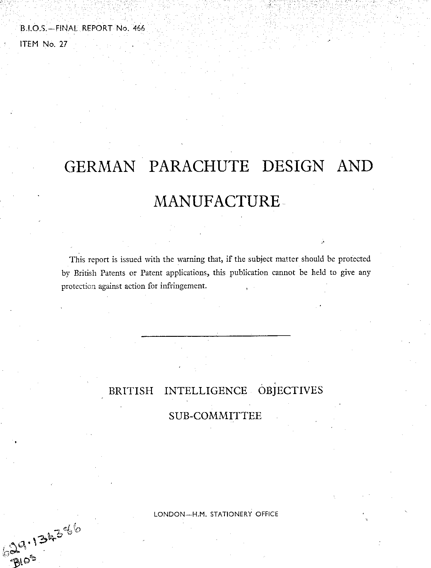 Keywords: Types of Parachutes developed; Ribbon (Cobweb type); Wako ribbon chute, Mushroom types; Triangular design; Faden-Schirm; Paper parachutes; Silk - Perlon (≈ Nylon) - Rayon - Zellwolle - Zellwolle-Jute; Emergency exits - Paratrooping - Containers - Dive brakes - Landing brakes - Bombs and mines - flares - torpedos; Wind tunnel tests; Models from tower and Gas holder; Electro magnetic shock measuring devices; High speed release from bombs; Normal aircraft release; Forschungsanstalt Graf Zepplin at Stuttgart - Ruite short title F.G.Z. ; Prof. Madelung Head Institute - Dr. Heinrich Head of Aerodynamic Section - Dipl.-ing. Knacke - Dipl.-ing. Neuhauser; Herr Kostaleszky now living in Schützebhansle, Weingarten - Hett Einig Prof. of Aerodynamics - Herr Buss interrogated in England chief parachute test jumper at Rechlin; Herr Christensen interrogated in England Head Parachute Section at Air Ministry; Herr Bahr interogated in England manager of one of the Autoflug factories repairing parachutes; Benger Gerätebau Boblingerstrasse 72 Stuttgart - interviewed Dr. Woernle technical manager - Herr Benger Propietor - Herr Goebel factory manager; Schusterinsel Opladen near Cologne (Köln) - Unter-Sturmführer Schauenburg in P.O.W. Camp 93 - US 7th Army disigner of triangular chute and technical manager at Henking Berlin; Köhler Uhrenfabrik Laufazholz? near Nürnberg - makers of barometric fuses; firms: Henking Berlin - Schöder Berlin - Autoflug = parachute manufacturers; Scholz Hamburg borometric fuses - Rheinmetal-Borsig barometric fuses; AEG Berlin makers of the gun for firing parachute models; Delius & Sohn Bielefeld weavers of fabric; Kammerer Osnabrück papaer parachutes; August Köhler Oberkirch near Karlsruhe chemical treatement of paper; Spön Neckarsulm Nr. Heilbronn spinners of weavers of paper; Schirm & Co. Kirchenlellinsfurt Nr. Tübingen spinners and weavers of paper; WAKO ... ; paratroop training school at Wittstock in any of their non-oscillating designs ... ; Schade Braking System .. ; Wako Ribbon Chute .. designed by Walter Kostalenzky .. ; paper parachutes successful undertaken by Herr Neuhauser at F.G.Z....; Dr. Heinrich at F.G.Z. ... Torpedos ... ; wind tunnels at F.G.Z. .. ; electro magnetic shock measuring device .. ; High speed release for bombs in this manner tested at speeds at high as 1100 km/hr (683 m.p.h.)