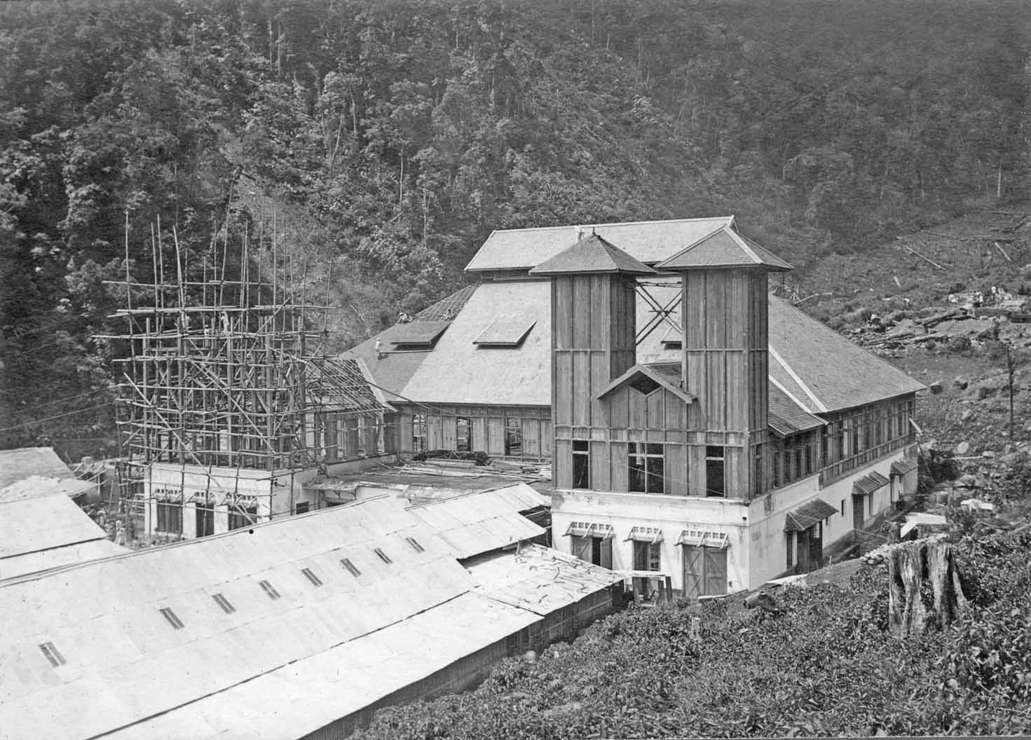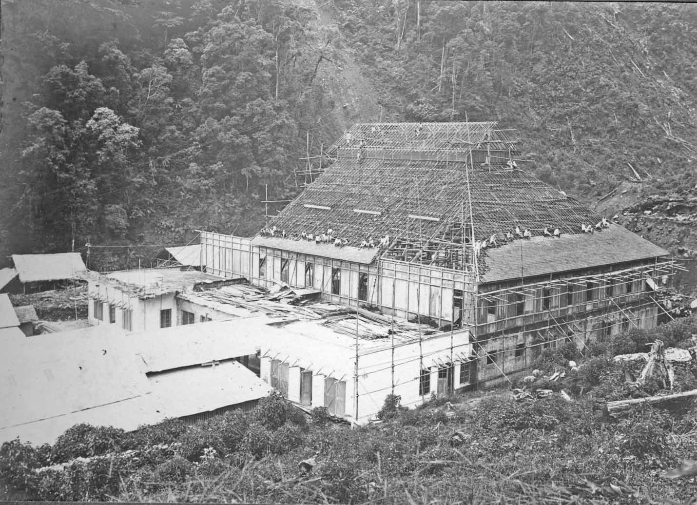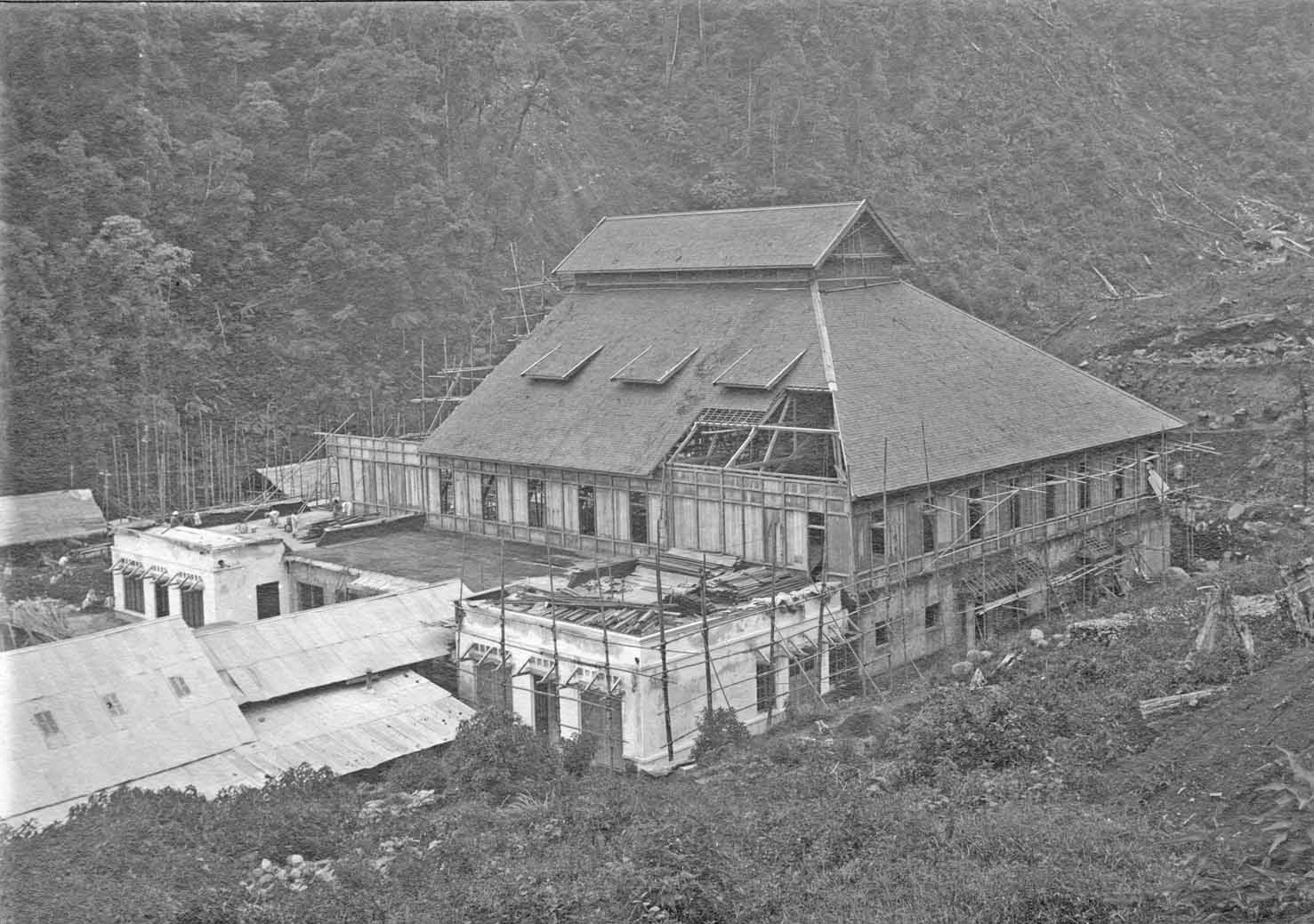 Viewing the right-hand side antenna tower under construction. Please notice also the clouds hanging in the canyon. Living and working at Malabar was often quite unpleasant for most days of the year. Particularly in the wet seasons. Klaas Dijkstra once recorded, that it was officially prohibited that, in his own living place (a few hundred metres from the station building), an electrical stove was used! Consequently, they had to cope with a cold and wet house; where drying was sometimes rather difficult. Have you ever slept in a clammy bed? Those familiar, do know what moist means!