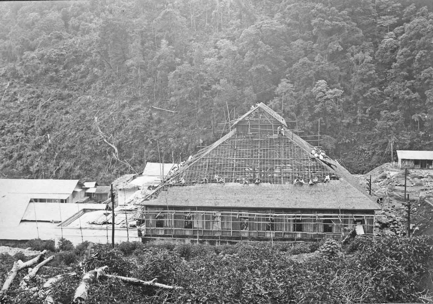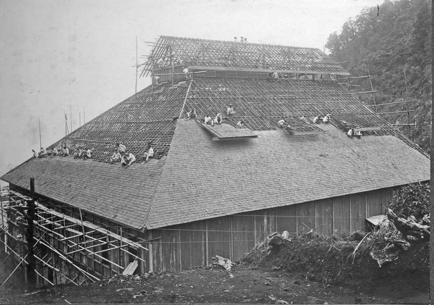 The Indonesians are building most beautiful and ingenious bamboo constructions, even rather complicates ones. They are real masters of this art. The roof tiles might have been made of 'iron wood' a natural product highly resistant to a tropical environment!