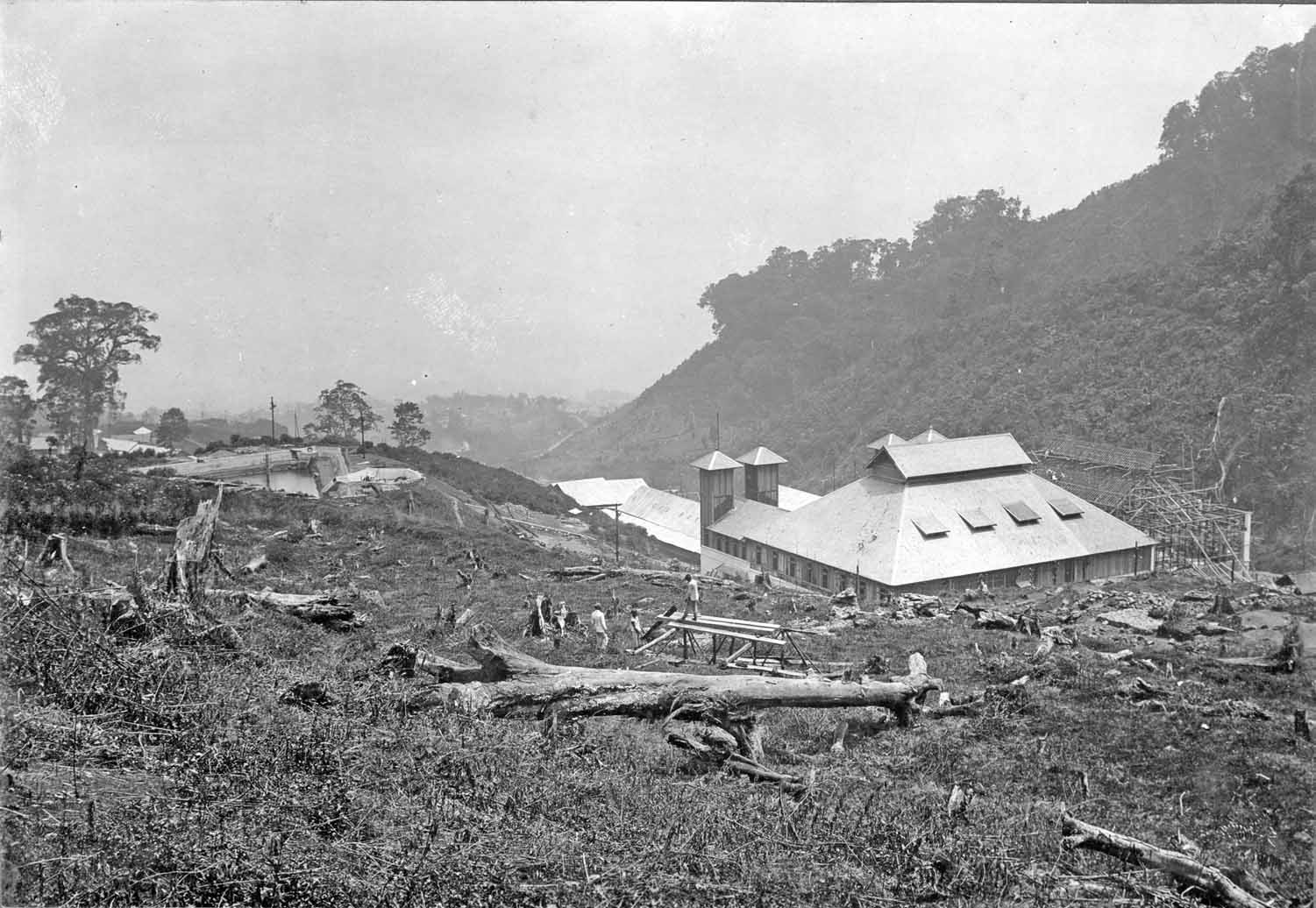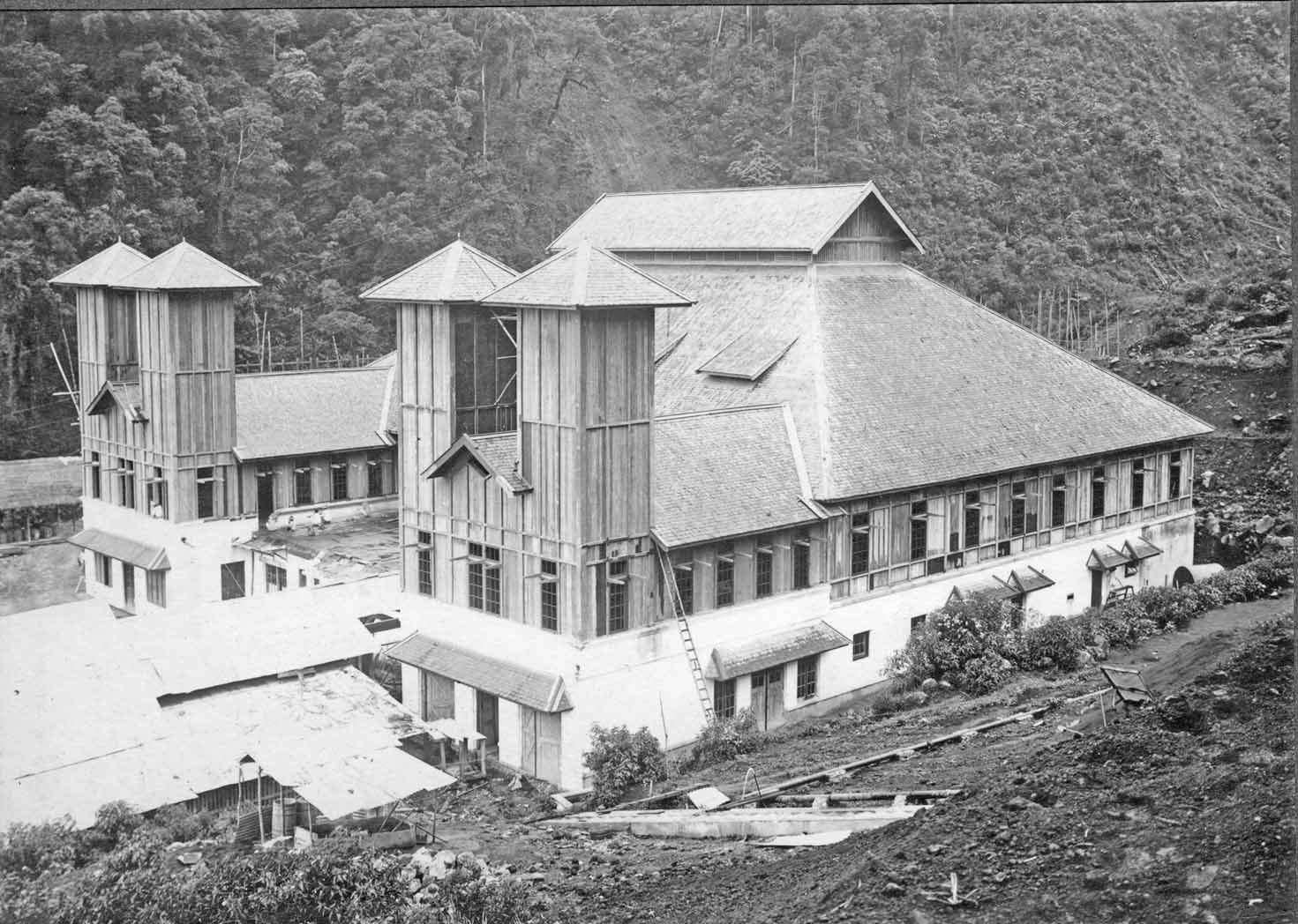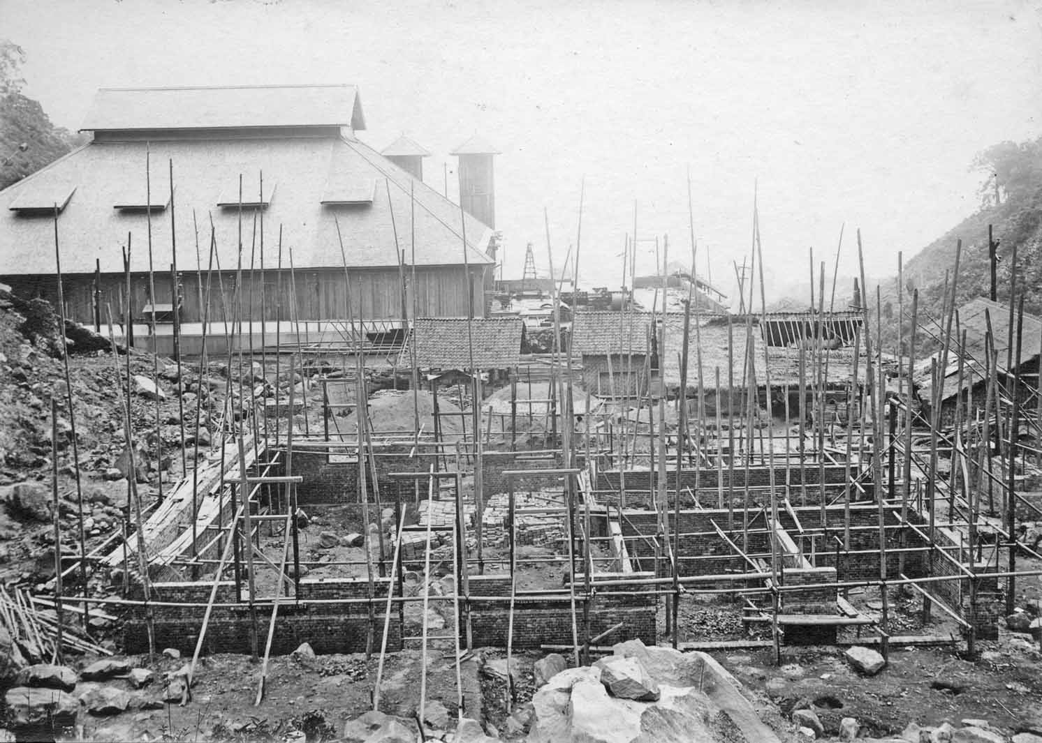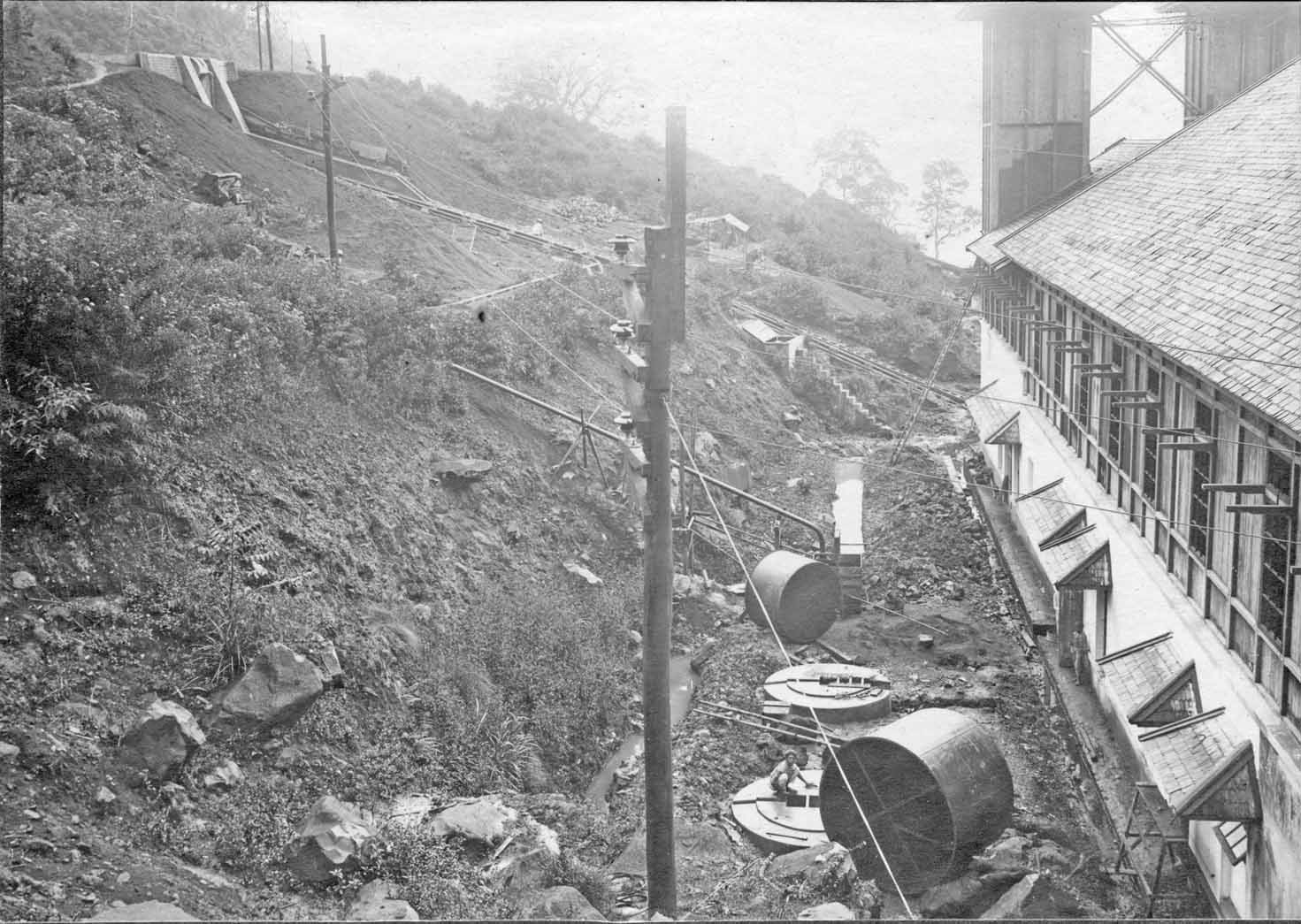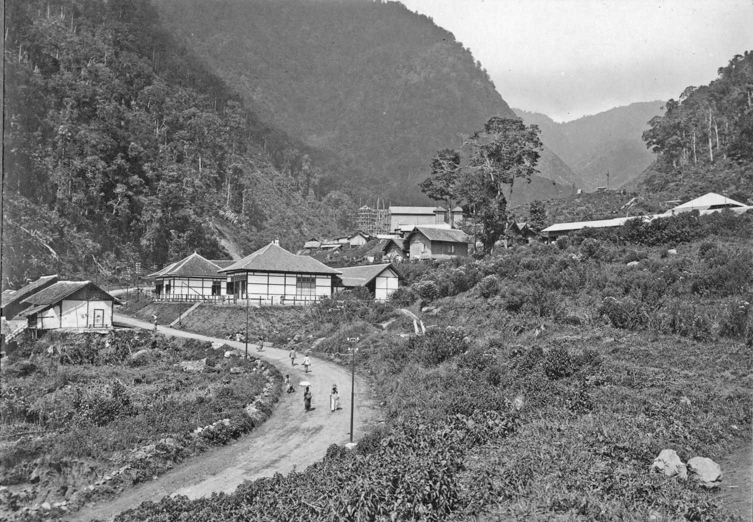 Looking from the western canyon slope towards the Bandung high-valley. Please notice the triangle pond on the left, which must have a supplementary water basin, as, from what we know, the main cooling pond was in front of the station building. Maybe, the latter had more an ecstatic function. This latter pond still existed, when we visited the site in 1994. However, there did not exist any building, but the concrete ground floor of the station building.
