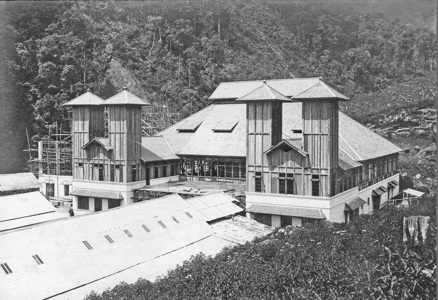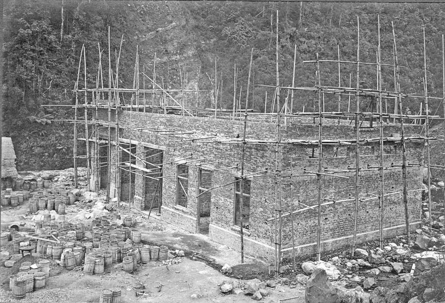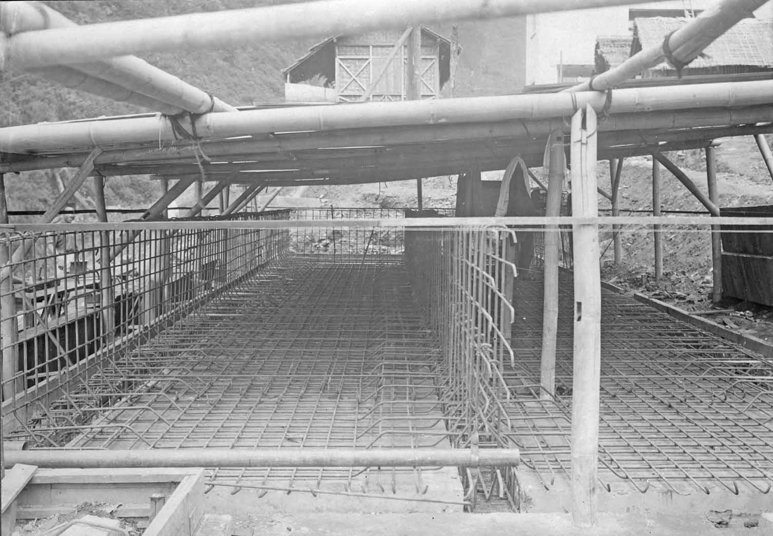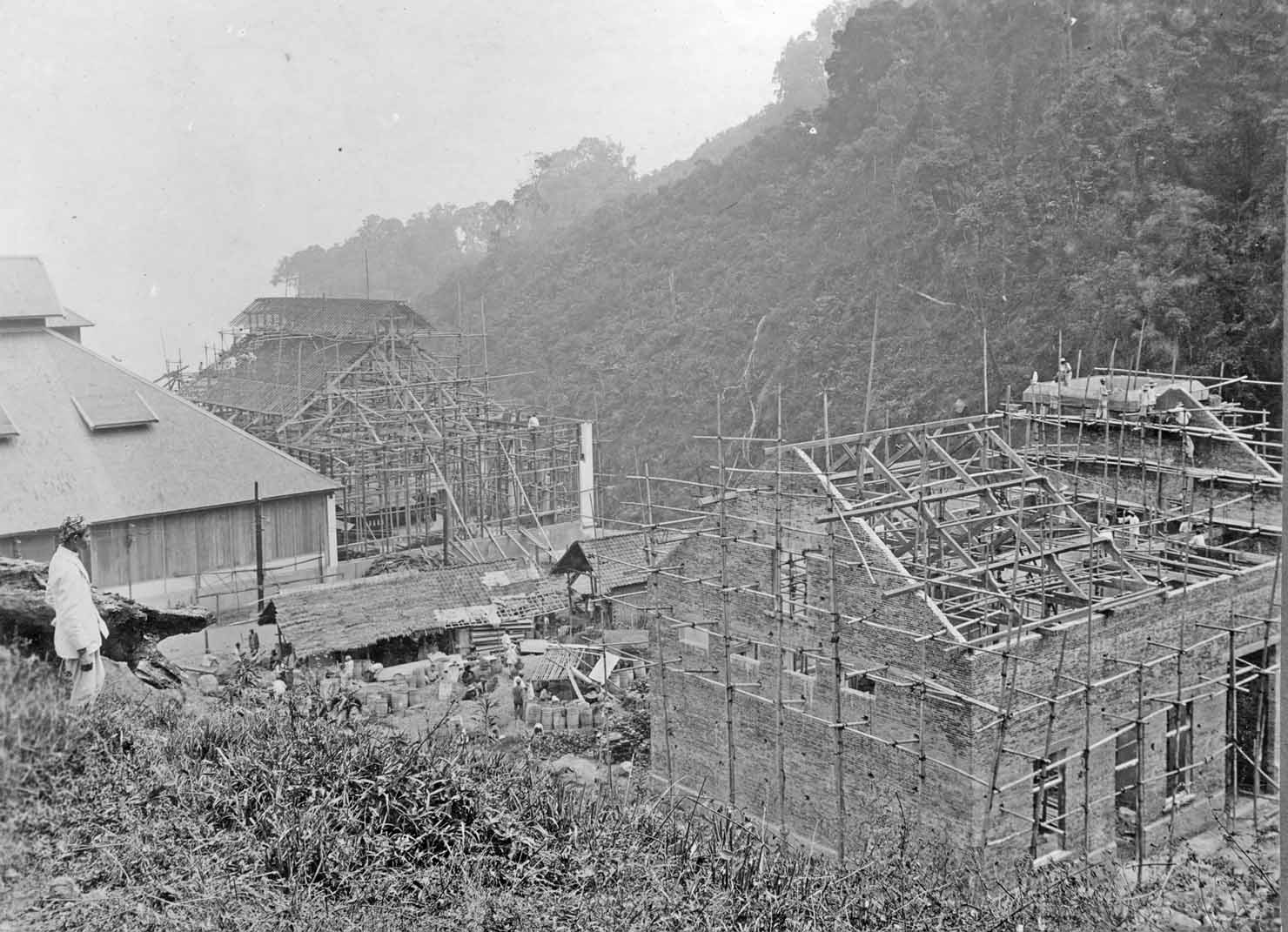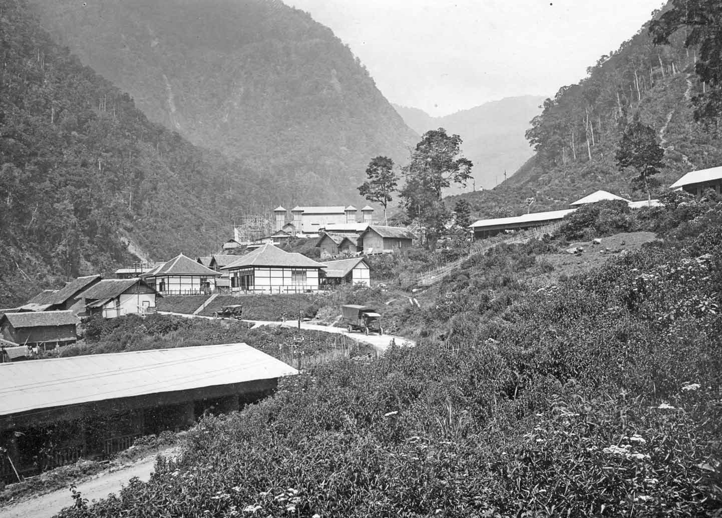 Looking from the western canyon slope towards the Bandung high-valley. Please notice the triangle pond on the left, which must have a supplementary water basin, as, from what we know, the main cooling pond was in front of the station building. Maybe, the latter had more an ecstatic function. This latter pond still existed, when we visited the site in 1994. However, there did not exist any building, but the concrete ground floor of the station building.