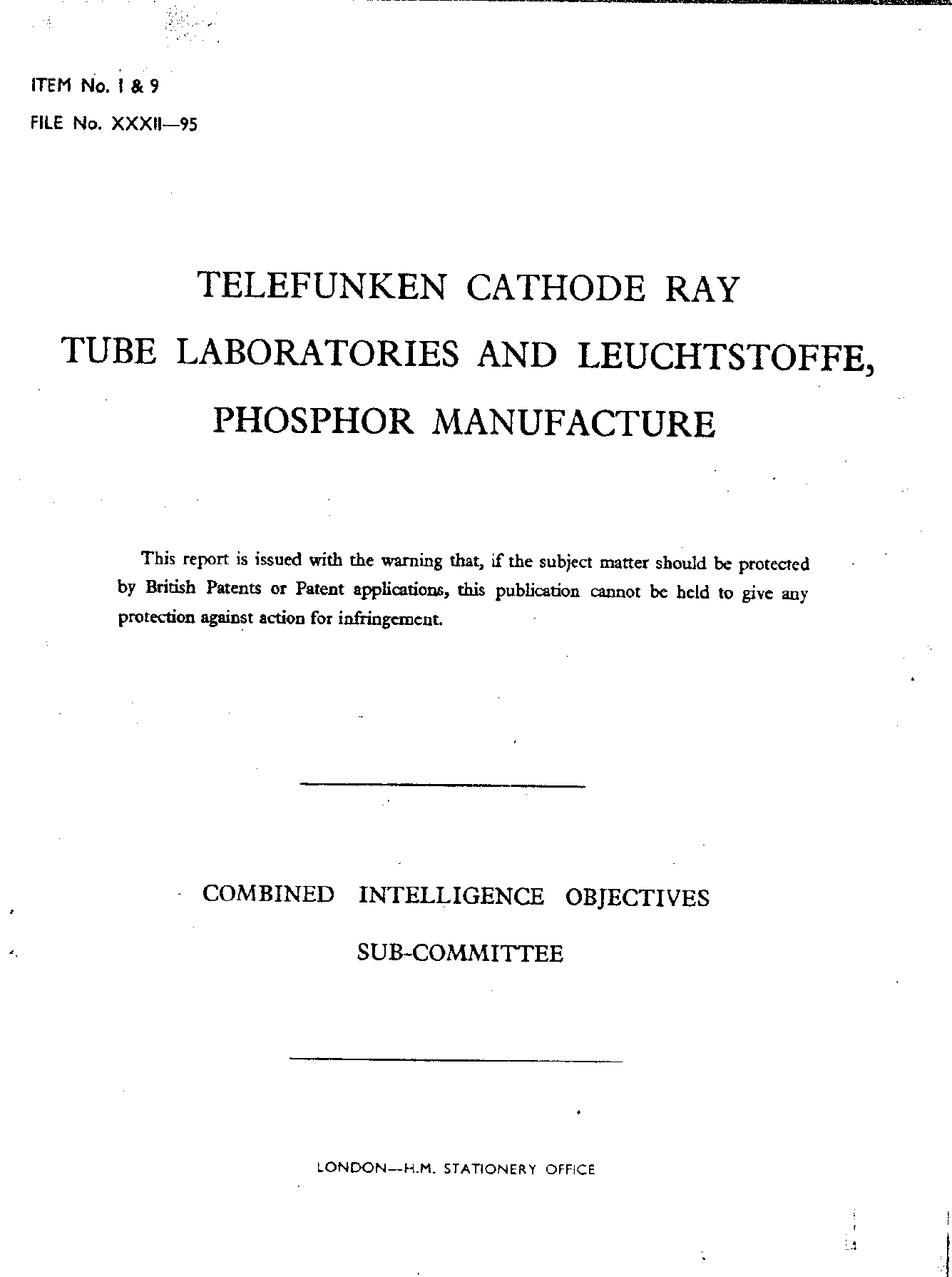Keywords: Iconoscopes (Telefunken - Bad Liebenstein); Crystal Valves (Telefunken - Bad Liebenstein); Dark Trace Tubes (Physical Instute Göttingen University); Cathode ray tubes (Telefunken - Bad Liebenstein); Phosphors (Leuchtstoffe -Steinbach); Light valves Picture Storage tubes etc. ; Synthetic quarz crystals for frequency control; materials evacuated; summary of other targets and personnel mentioned during the visits; The Telefunken Laboratory at Bad Liebenstein and the neighbouring Leuchtstoff factory at Steinbach were investigated .. ; Leuchtstoff was a separate company foormed ... ; Dr. Kamm and Dr. Funk were interrogated .. samples of fluorescent materials were obtained .. ; Physics Institute University of Göttingen .. Prof R.W. Pohl included in its activities dark trace (Blauschrift-Röhre or Skiatron, AOB) ... ; Staff interrogated Pr. Kupfermann - Dr. Mollwo - Dr. Hachenberg; Iconoscopes .. the work was undertaken by Telefunken mainly for the purpose of television .. ; Dr. Gold at Marburg University .. ; Super Iconoscope The work on this tube had been done by Dr. Thiele .. Prof. Schröter claimed that the tube was roughly 10 times as much sensitivity as the standard iconoscope .. ; Leitz Wetzlar .. ; The Orthicon ... Dr. Wendt - Prof Schröter M. Barthemlemy of the Compagnie des Compeur in Paris .. ; Semi-conductive tube ... ; Crystal valves Dr. Bartels described the work which he had been doing ... ; Dark Trace Tubes ... (LB50 principle, AOB) ... the tungsten film was semi-transperant ... ; Dr. Gundert said that ... ; Projection tubes .. ; Reduction of Astigmatism .. ; Monoscope .. ; p7 screens .. ;Two colour screens .. The Luftwaffe directed Telefunken to investigate the possibility of using a 2 colour tube for moving target discrimination in the Autumn of 1944 .... ; Phorphors (Leuchtstoffe ... ; properties of zinc sulphide - zinc selenide phosphors ... ; a demountable cathode ray tube was employed ... ; The development is due to a demand for a CRT screen of small dimensions capable of giving a good definition with television scans of 2000 lines ..... ; The Fischer-Amrein project .. ; Dr. Krawinkel of the reichspost had been working at Hirschberg Silesia (Sudeten Mountains) on a picture storage device ... ; Synthetic quartz crystals for frequency control .. Prof. Nacken in Schramberg ...