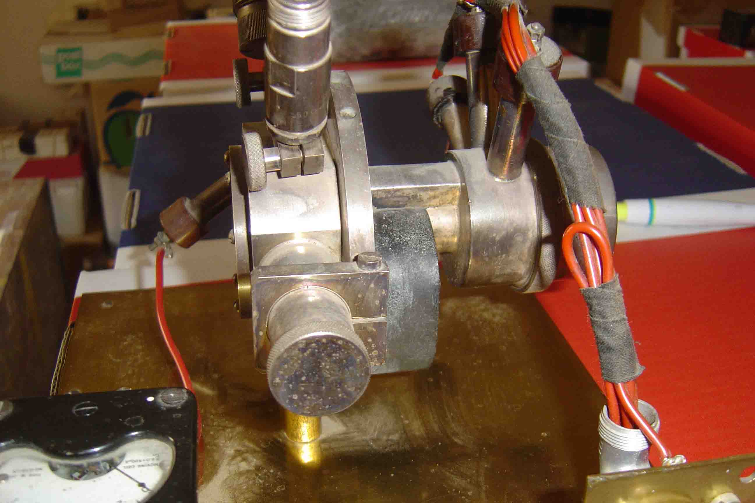 Side view of the test equipment. The circular section pointing towards us, might hold a rectifier diode. Right of it, in a more dark colour, is the magnet to the "Heil tube generator" (see next photo). Richard Trim kindly add to our discussions: Rod, The permanent magnet was used to focus the transverse electron beam in the Heil Tube.